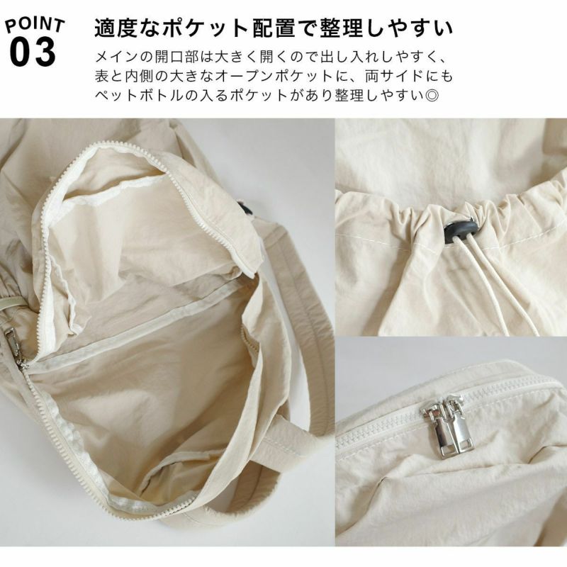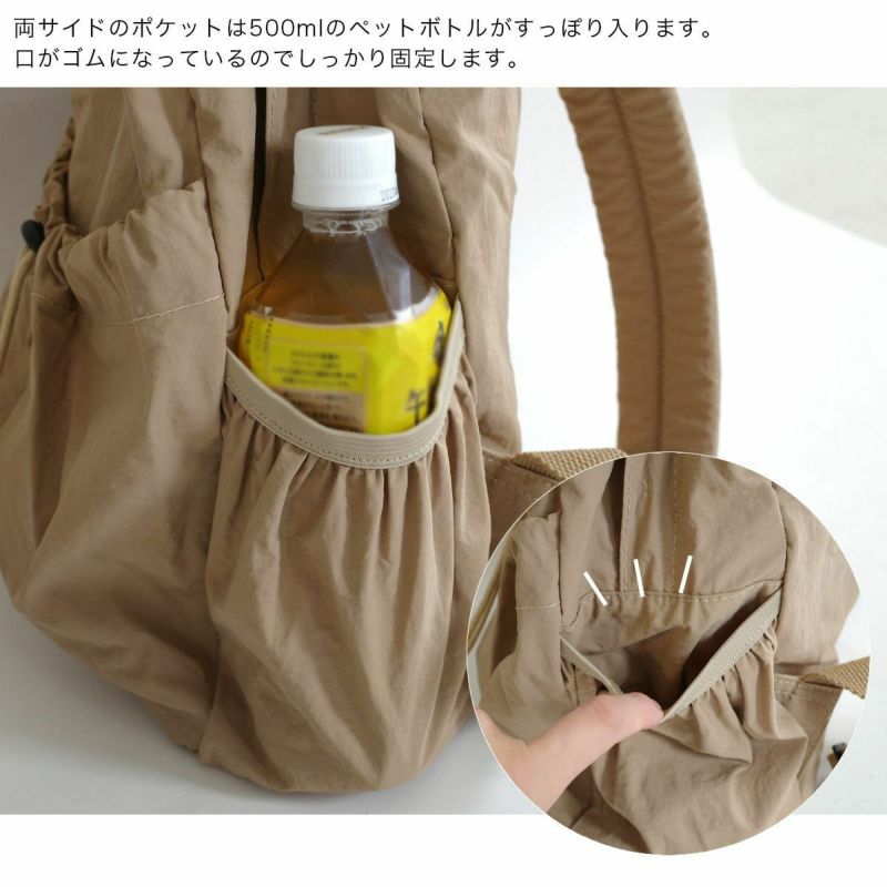 開口部は大きく開くので出し入れしやすく、見た目以上にたくさん入ります。大きなオープンポケットが2つと、両サイドにはペットボトルの入るポケット付きで整理しやすい◎