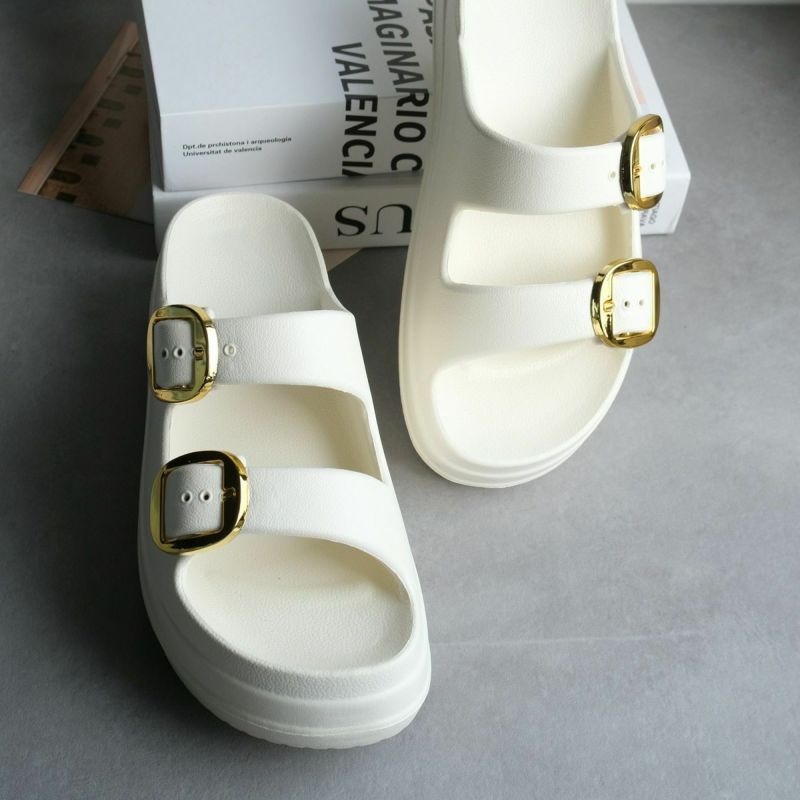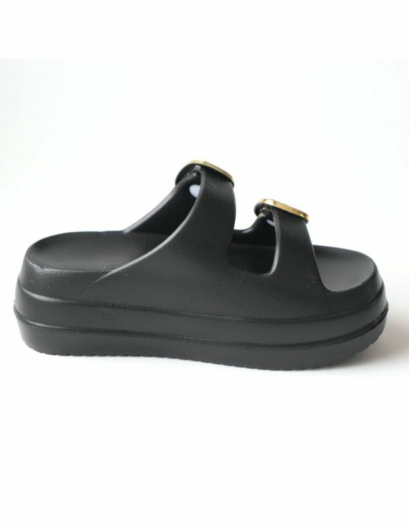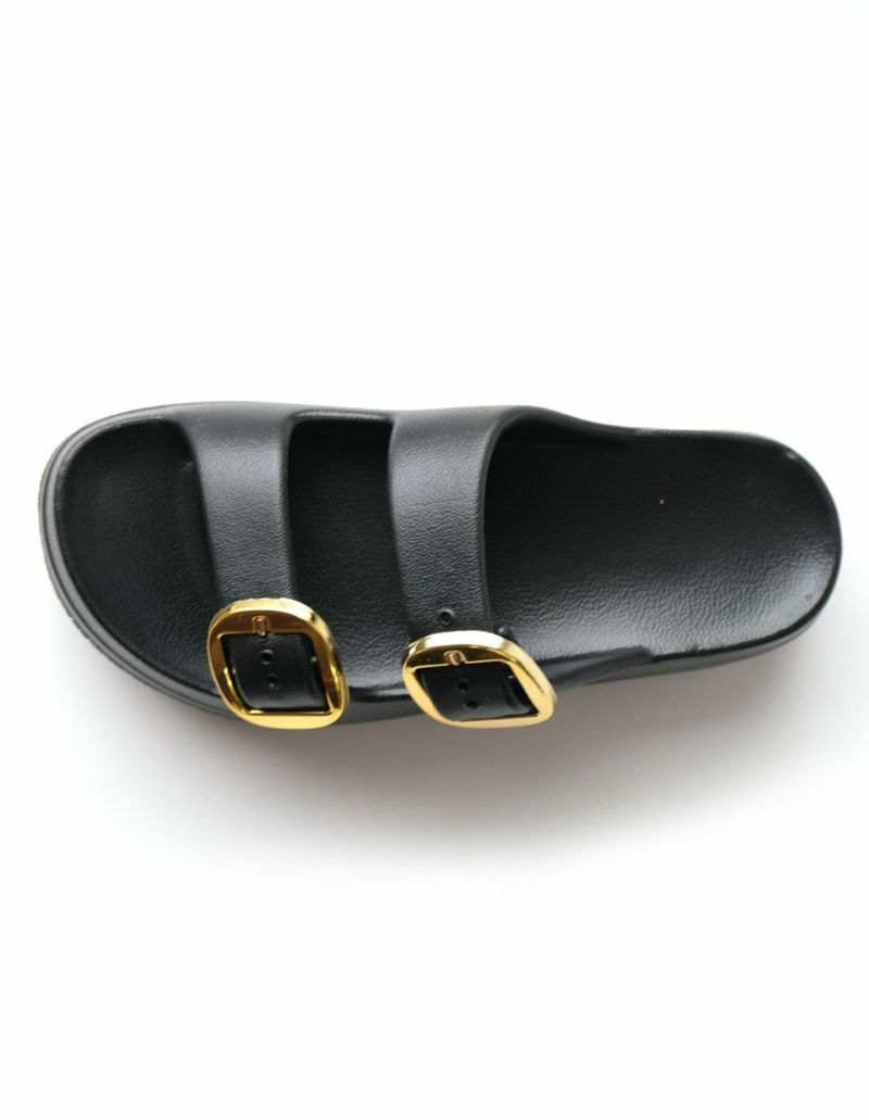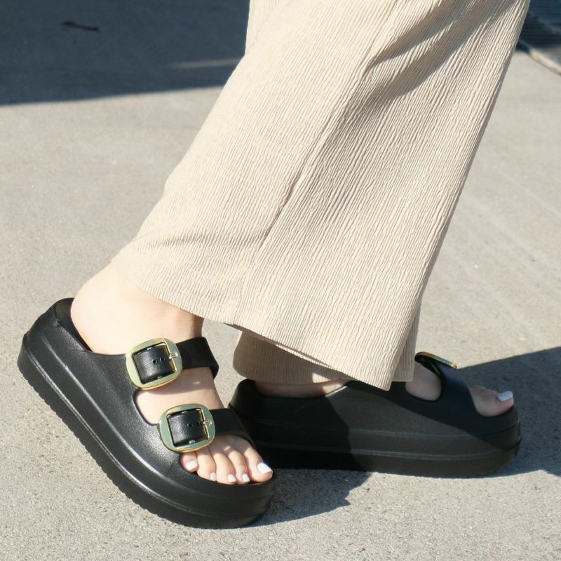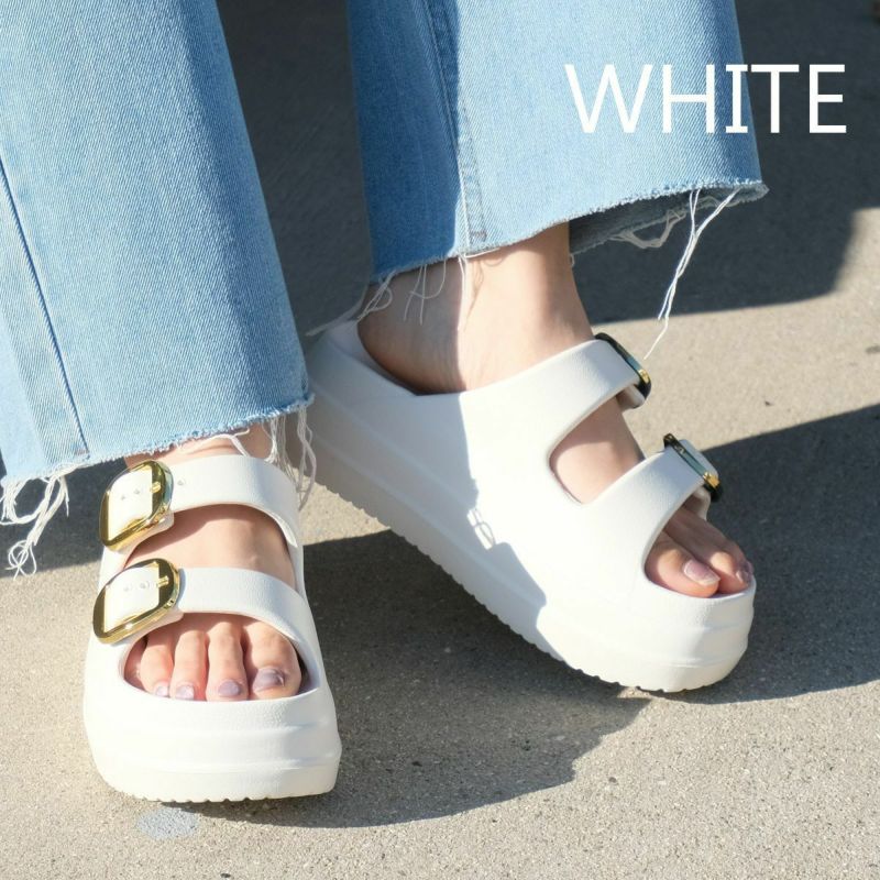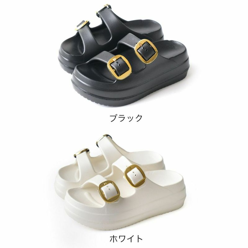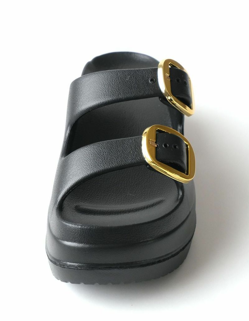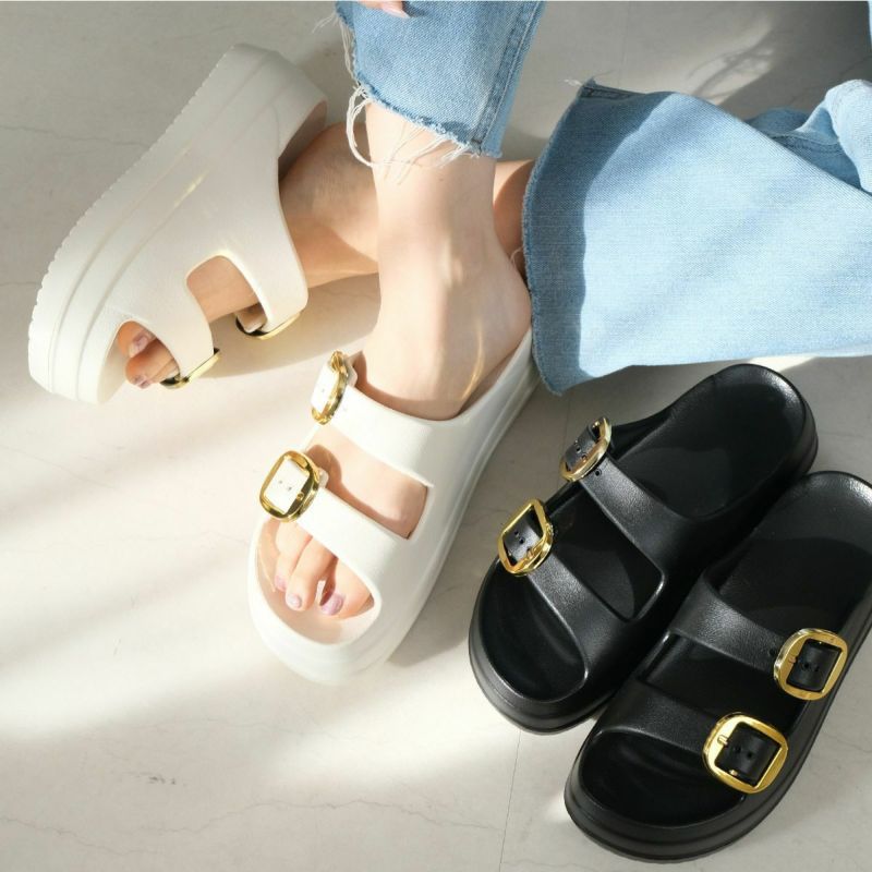 厚底ダブルベルトサンダルの定番デザインに大きめバックルがアクセント。