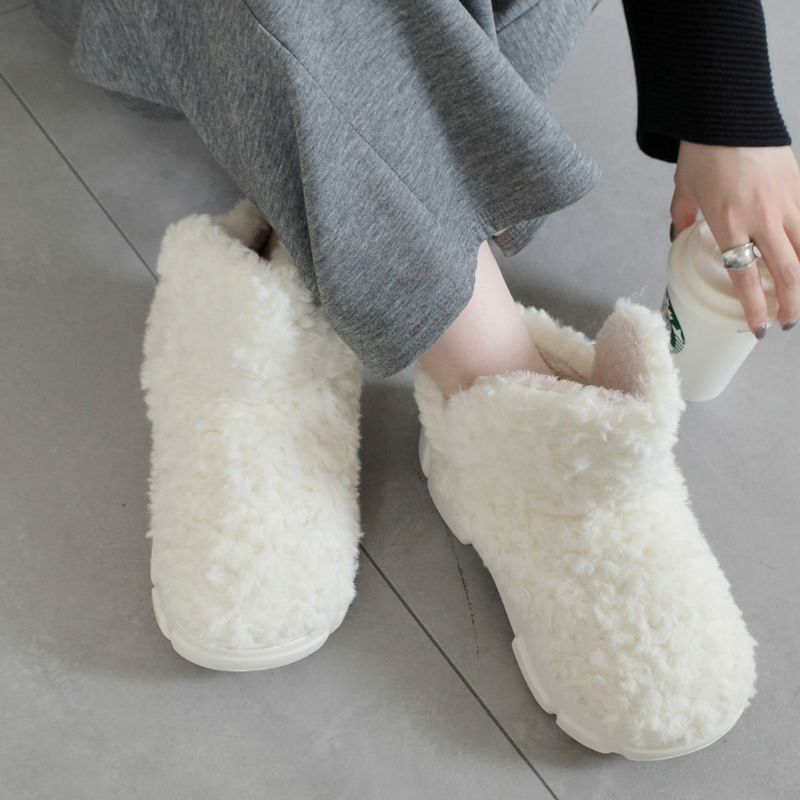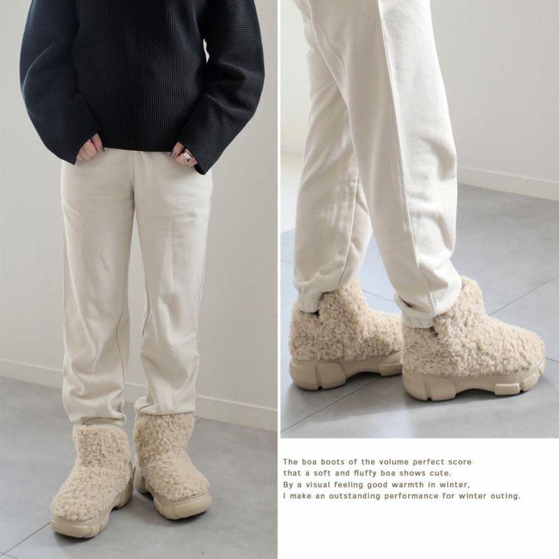 全体を覆うもこもことしたボア素材が、足元からしっかり暖かさをキープします。ボリュームのある厚底ソールは軽量で安定感があり、デイリーユースはもちろん、ちょっとしたお出かけにもぴったり。