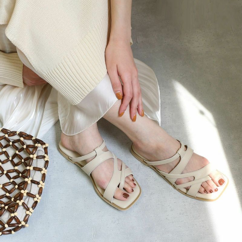 甲に重なり合うストラップが個性的でお洒落なサンダル。