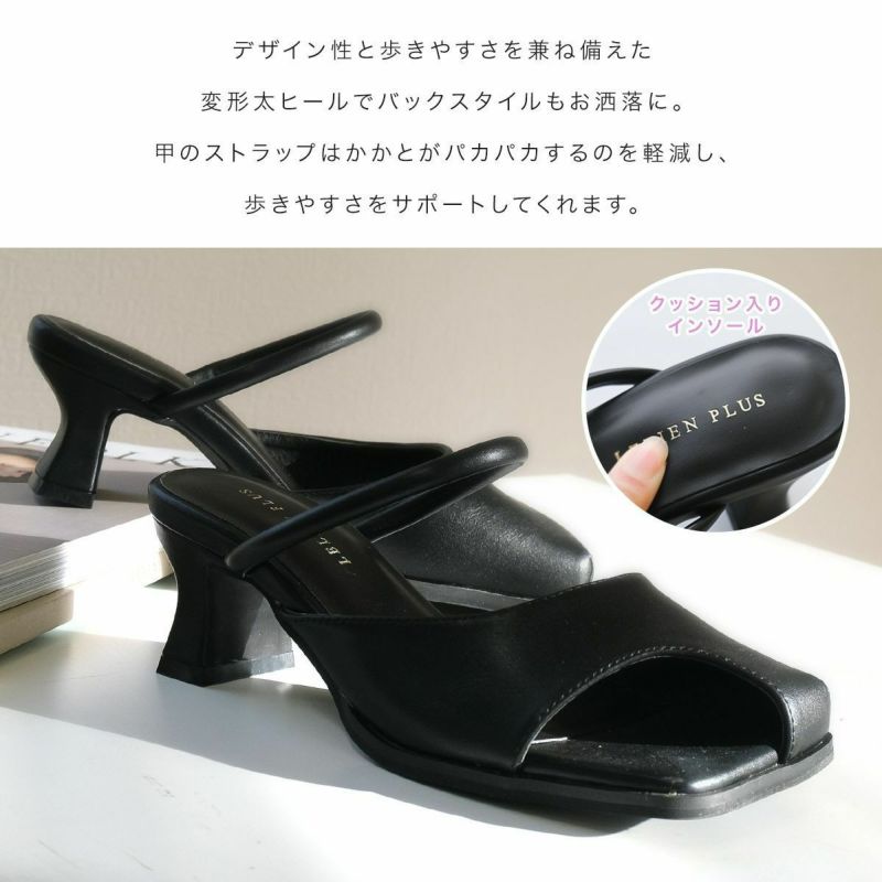 デザイン性と歩きやすさを兼ね備えた変形太ヒールでバックスタイルもお洒落に。甲のストラップはかかとがパカパカするのを軽減し、