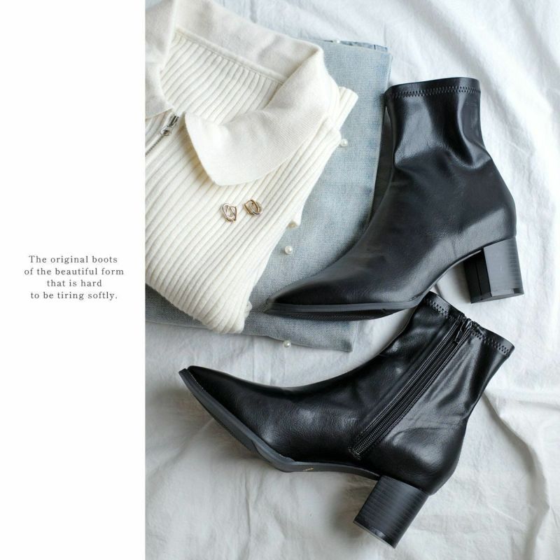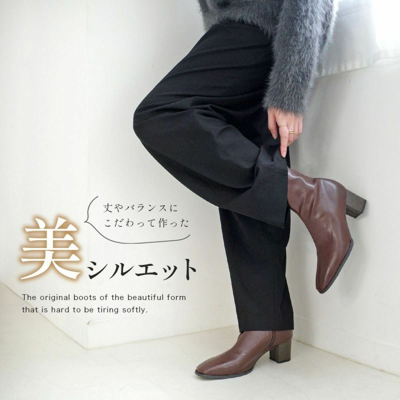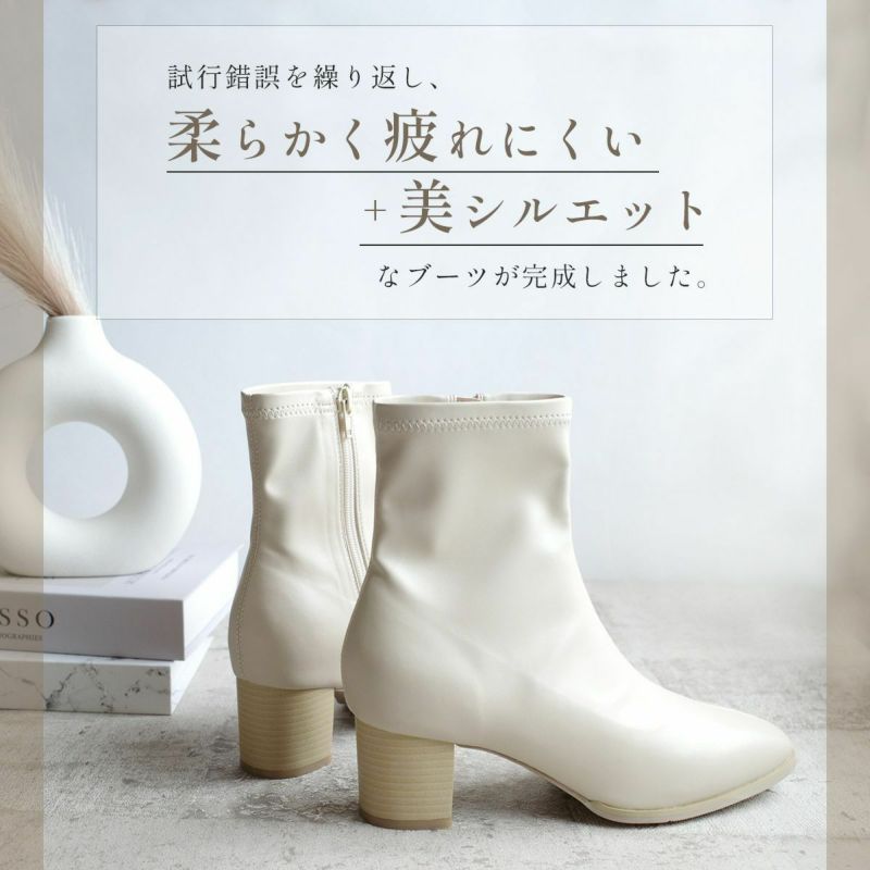 試行錯誤を繰り返し、柔らかく疲れにくい+美シルエットなブーツが完成しました。足首が窮屈になりがちですが、柔らかく伸びの良いストレッチ生地を採用しストレスフリーな履き心地です。