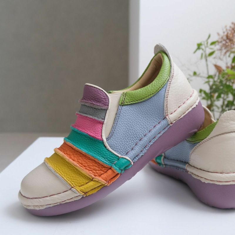 牛革パーツを1本1本丁寧に縫い合わせた大人気のカラフルサイドゴアスリッポンころんとしたまぁるいフォルムが可愛く、合わせやすいボーダーデザイン。