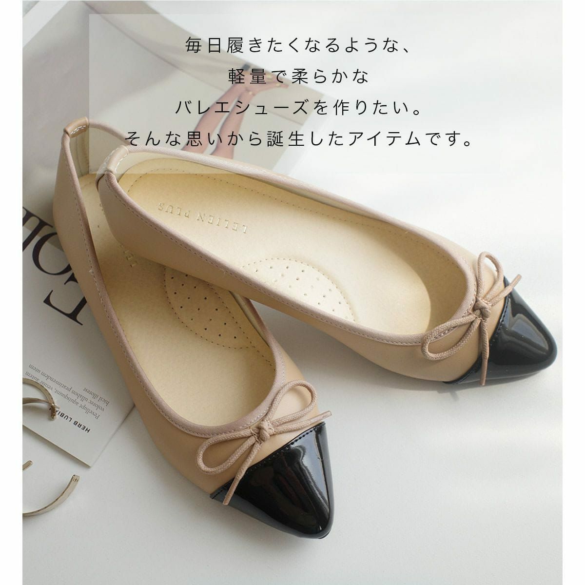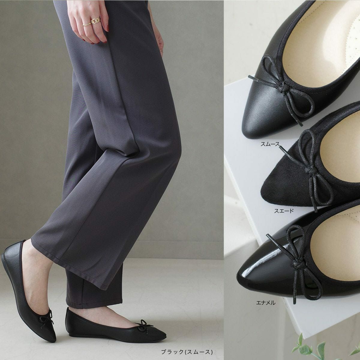 どんなスタイルにも合わせやすいバレエシューズ。