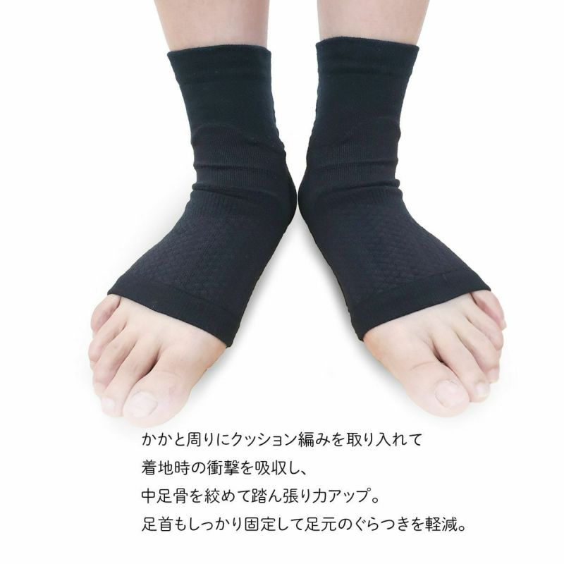 クッション編みでかかとの衝撃を吸収。足指の根本の中足骨を圧迫することで、指先が地面を掴むことかできるようになり、