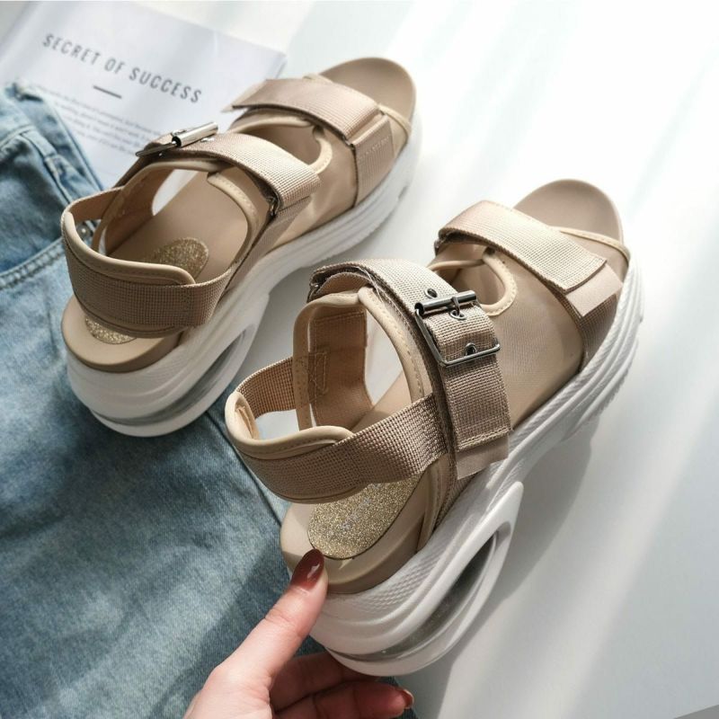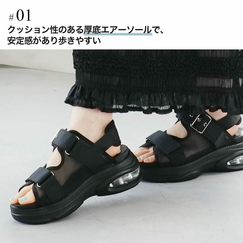 クッション性のある厚底エアーソールは、安定感があり歩きやすい調整可能な2本ストラップと、かかと部分はクッションパット付きで柔らかな履き心地