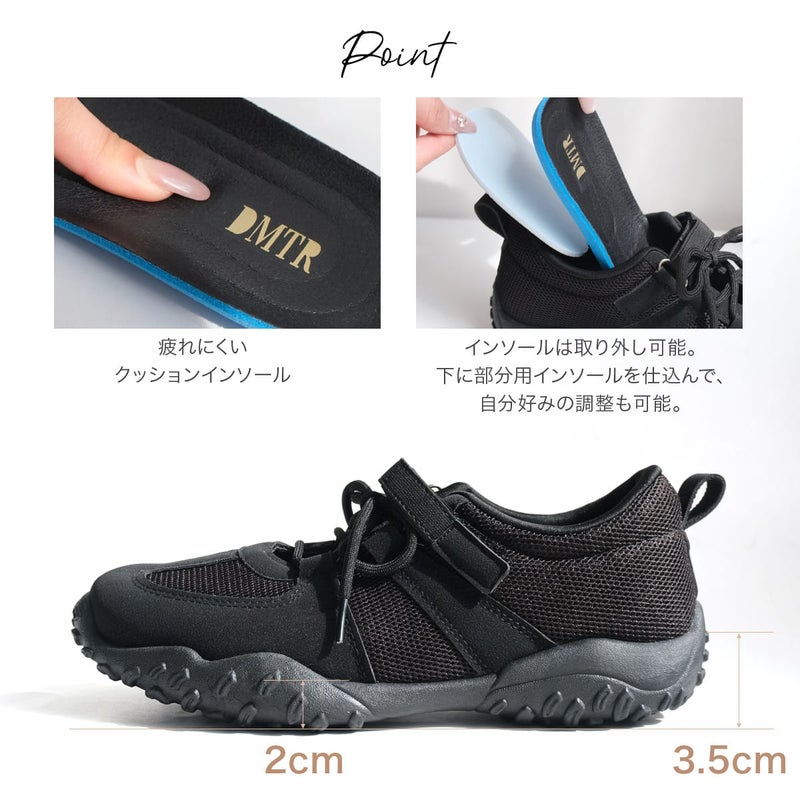 約3.5cmの高さで、無理なく重心を引き上げ、軽さを保ちながら、足元の印象に奥行きを与えます。