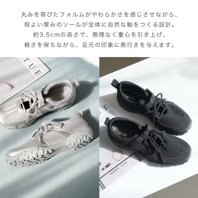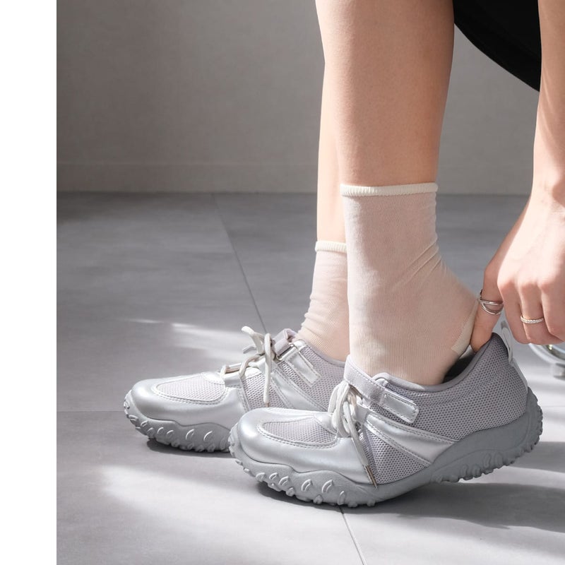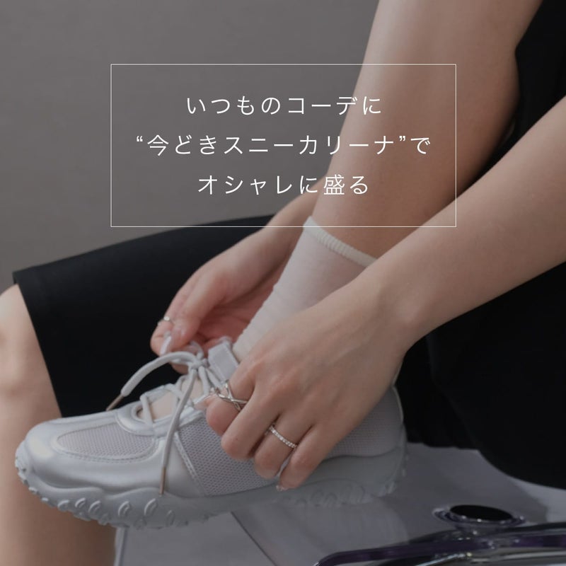 繊細さとラフさ、そのどちらにも寄りきらないバランスが魅力です。いま注目されているスニーカリーナの流れを取り入れ、足元に新しい抜けをつくります。