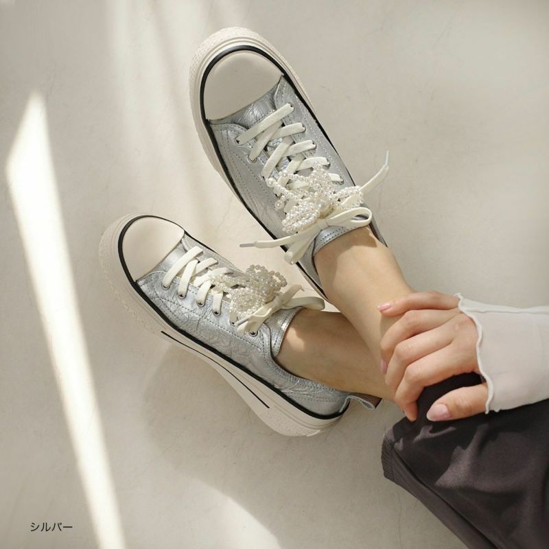 スニーカーの紐にパールアクセサリを取り付けていつものスニーカーをかわいく簡単アレンジ!