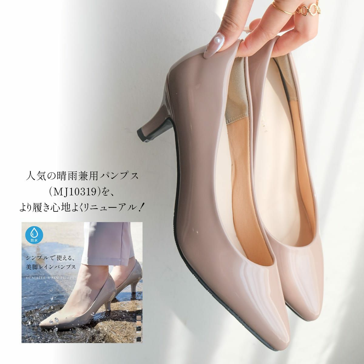 防水仕様&滑りにくいソールで雨の日も安心。人気の晴雨兼用パンプス(MJ10319)を、より履き心地よくリニューアルして登場!