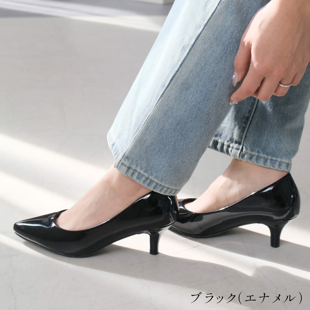 ポインテッドトゥのすっきりシルエットが、足元を美しく見せてくれます。
