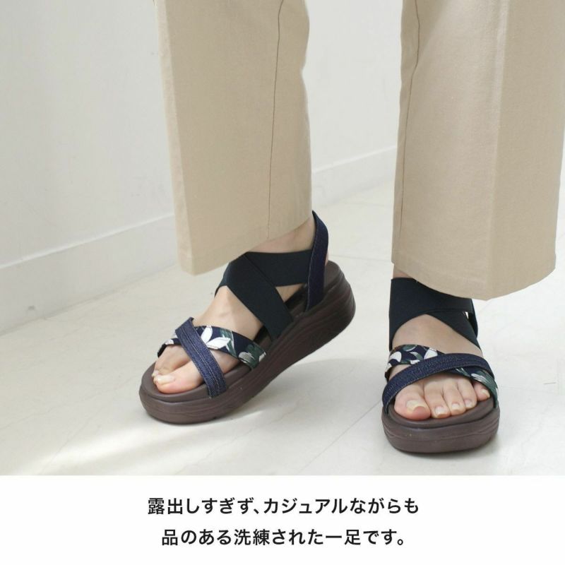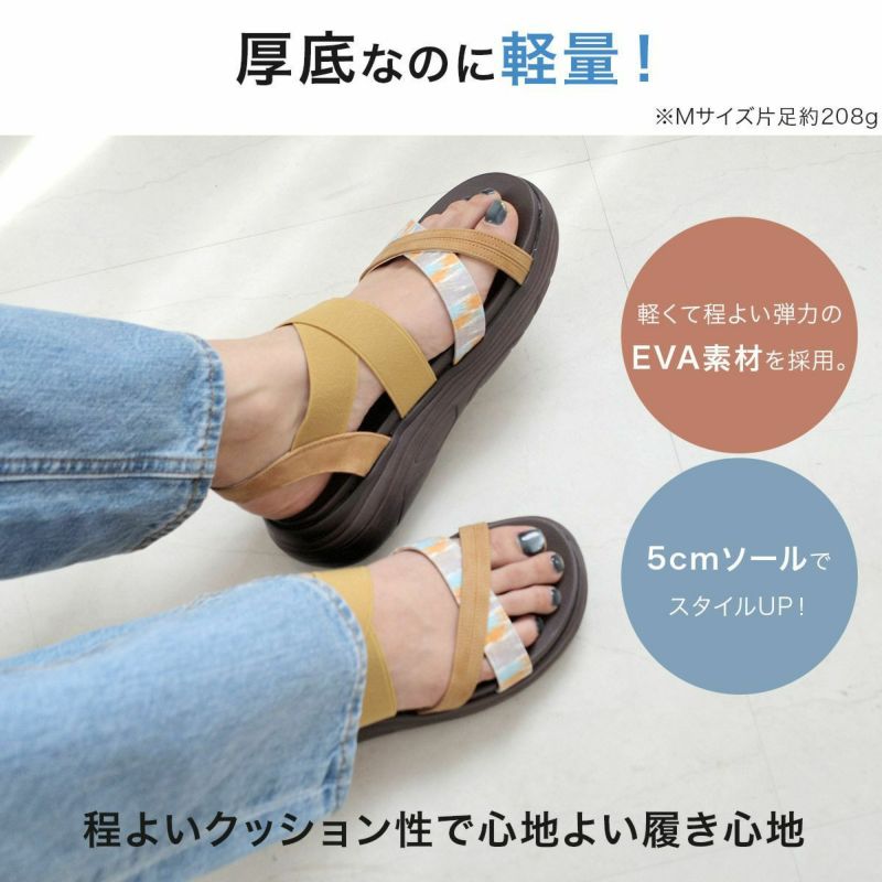 安定感抜群の厚底ウエッジソールで長時間履いても疲れにくく、歩きやすい。クロスゴムベルトがしっかり足をホールドしてくれて、ぴったりフィットして安定感抜群!