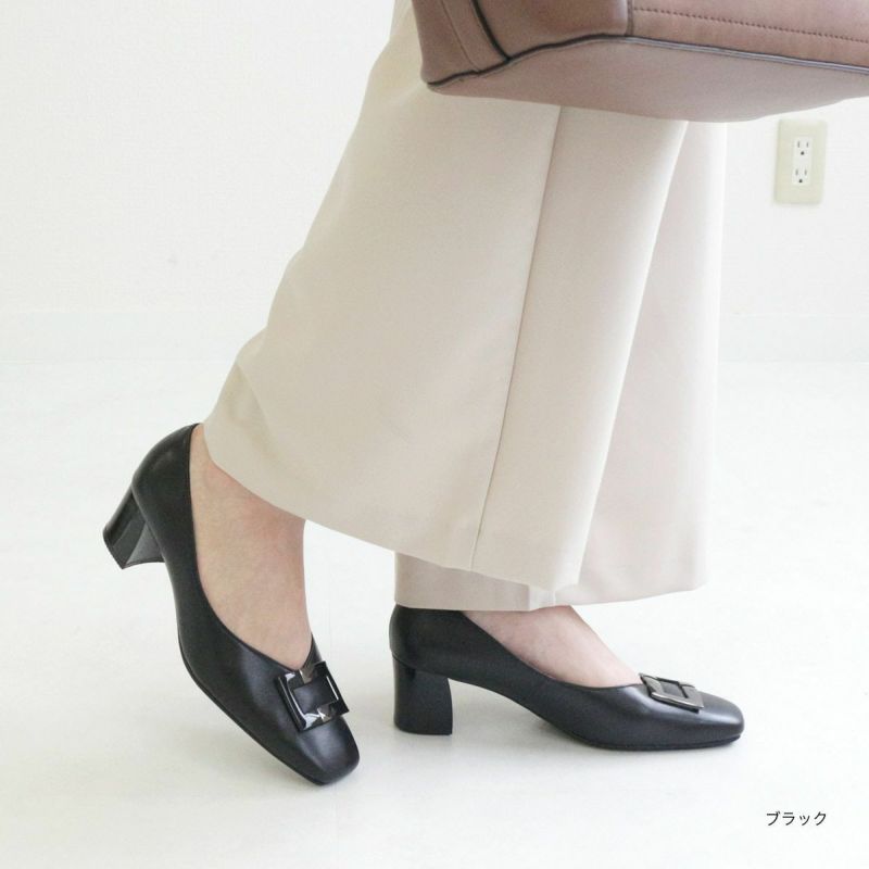 上品さと華やかさを兼ね備えた一足。旬のスクエアトゥでトレンド感がありつつ、Vカットでスッキリとした足元へ。
