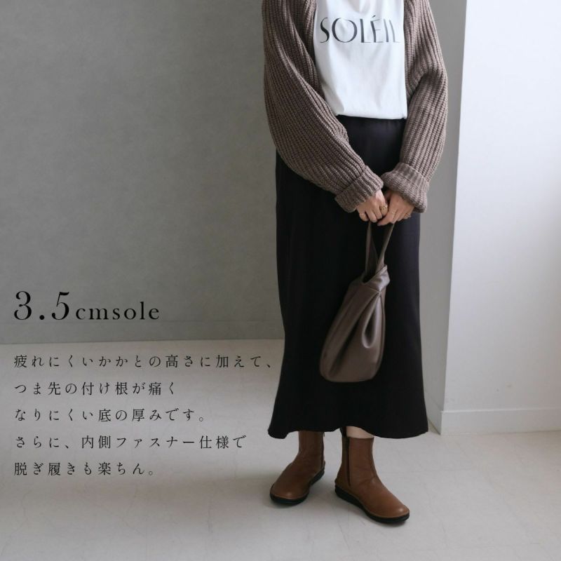 内側ファスナー仕様で脱ぎ履きも楽ちん。疲れにくいかかとの高さに加えて、つま先の付け根が痛くなりにくい底の厚みです。