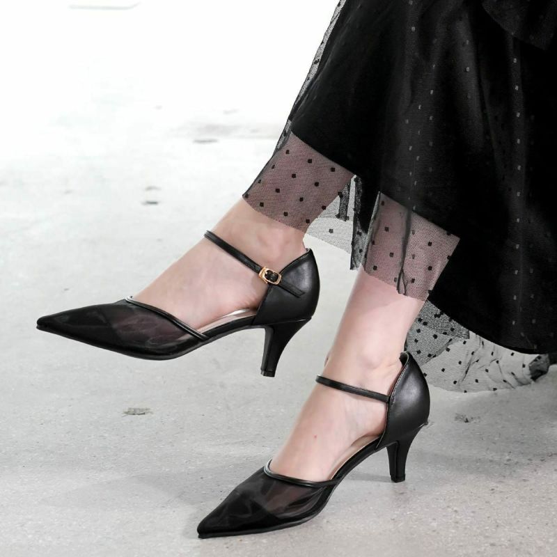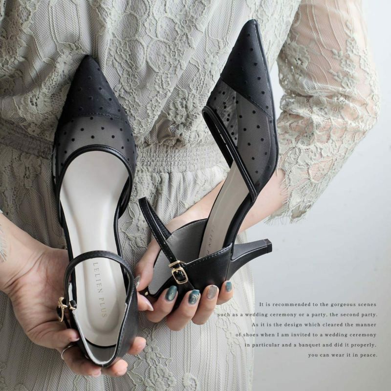 つま先・かかとが隠れた6.5cmの細いヒールで、チュールの透け感がエレガントな足元を演出します。結婚式や披露宴にお呼ばれした時の靴のマナーをきちんとクリアしたデザインなので、安心して履いていただけます。