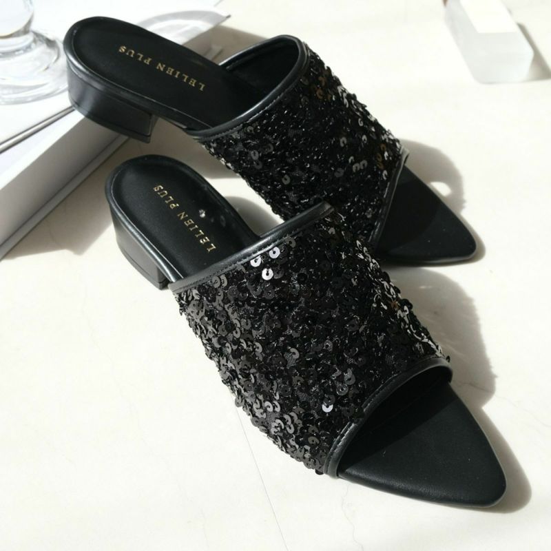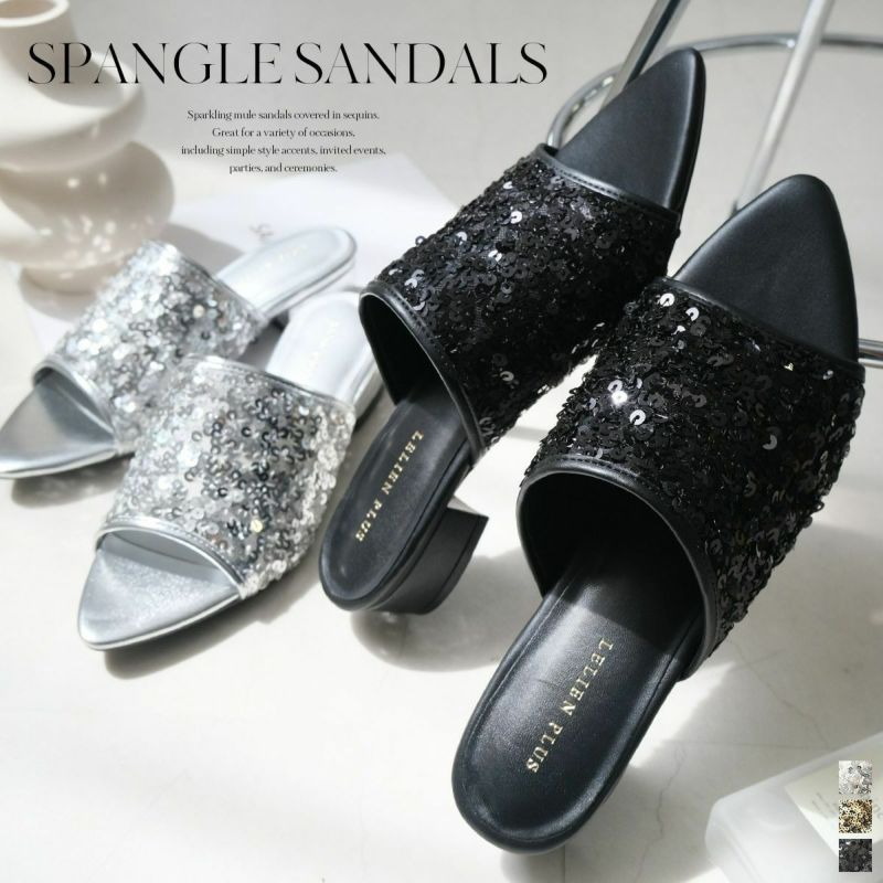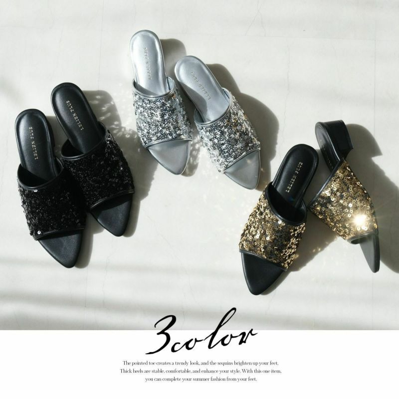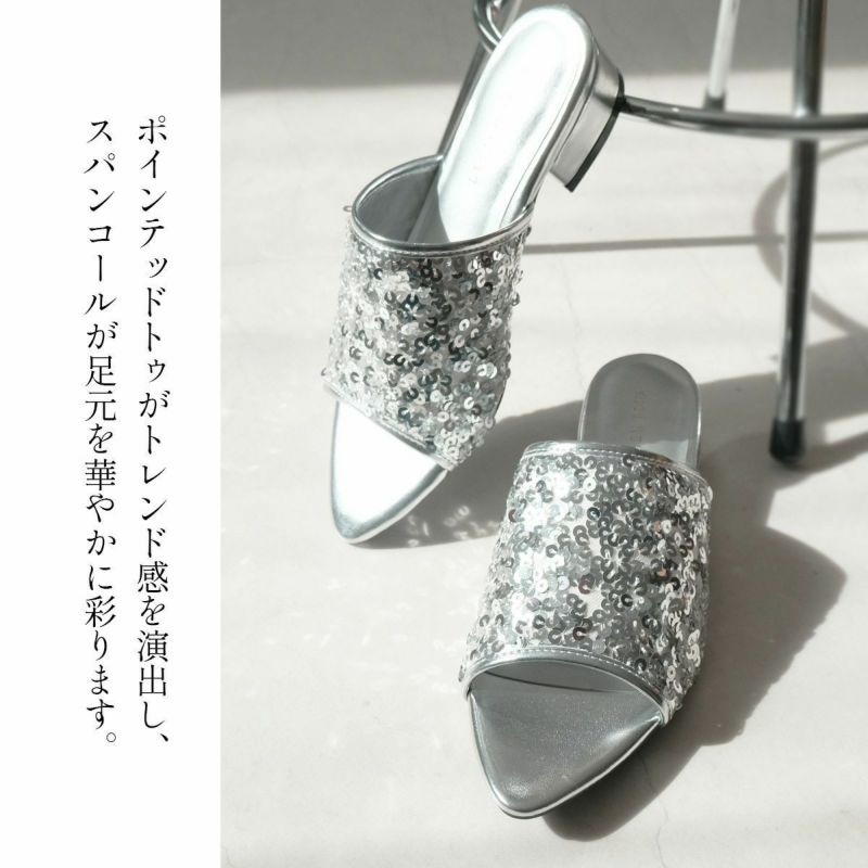 スパンコールを敷き詰めたキラキラと輝くミュールサンダル