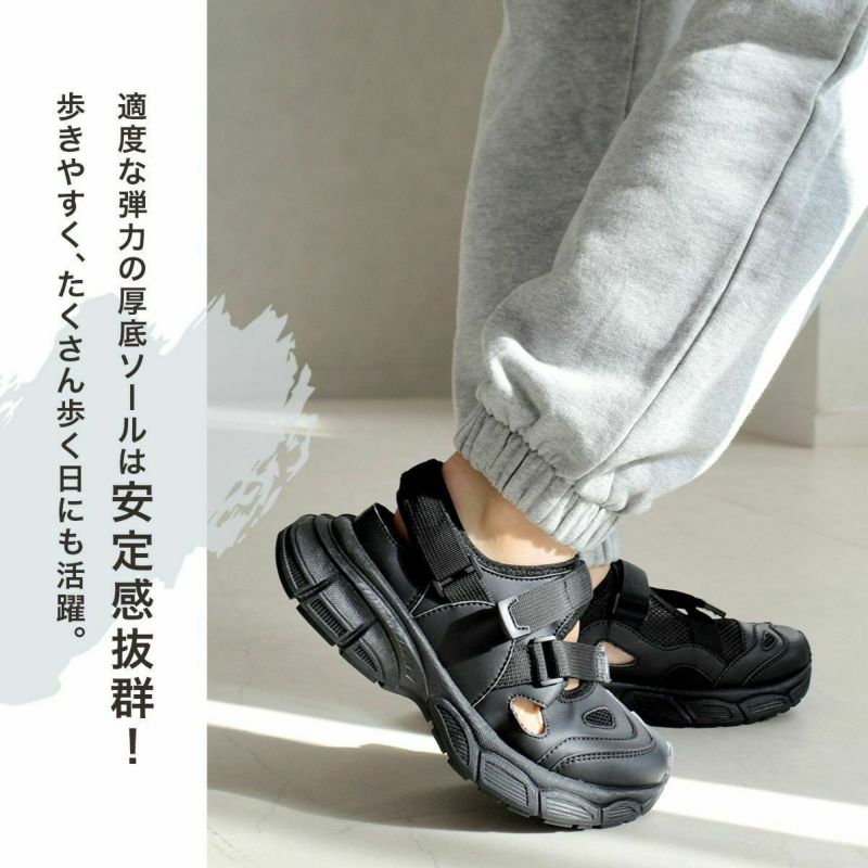 適度な弾力の厚底ソールは安定感に優れ歩きやすく、スタイルアップにも一役買ってくれます。