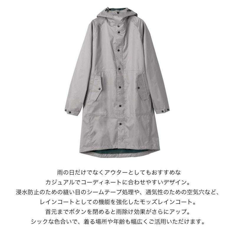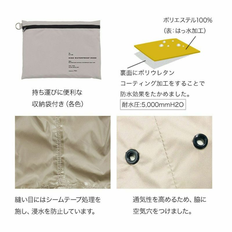浸水防止のための縫い目のシームテープ処理や、通気性のための空気穴など、レインアイテムコートとしての機能を強化。首元までボタンを閉めると雨除け効果がさらにアップ。シックな色合いで、着る場所や年齢も幅広くご活用いただけます。