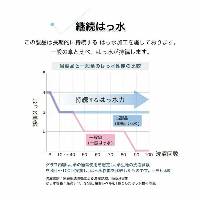 長期的に持続するはっ水加工を施しているため、一般の傘と比べ、はっ水が持続しますワンタッチで傘を開き、骨を閉じることができるため、 荷物が多い日や車で移動する時などに非常に便利です。