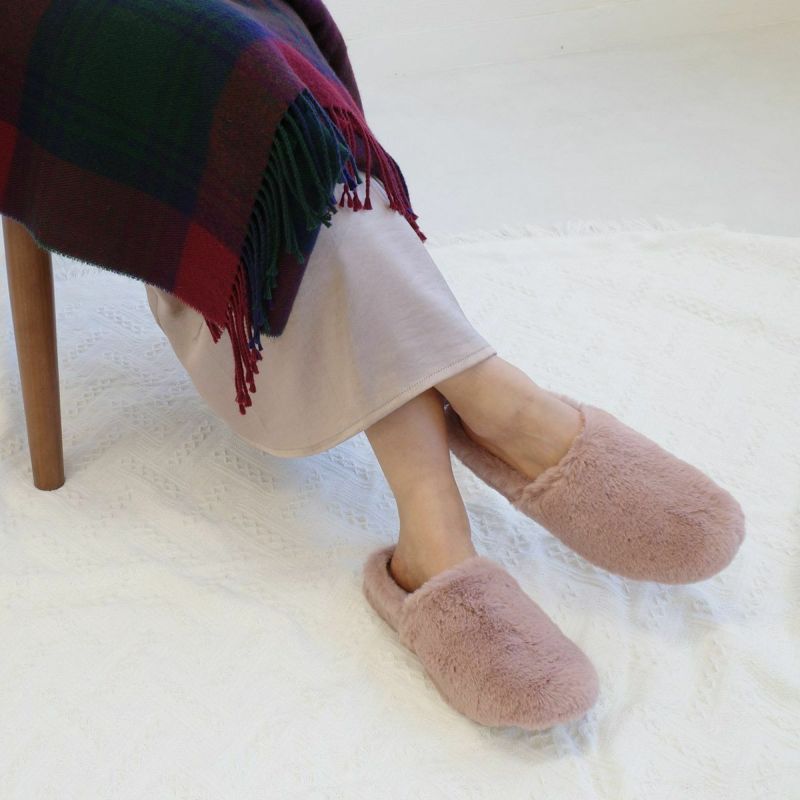 大人可愛い、くすみカラーのルームシューズ。もこもこふわふわのファーで冬のお部屋を可愛く快適に。内側メッシュ素材でムレを防止します。