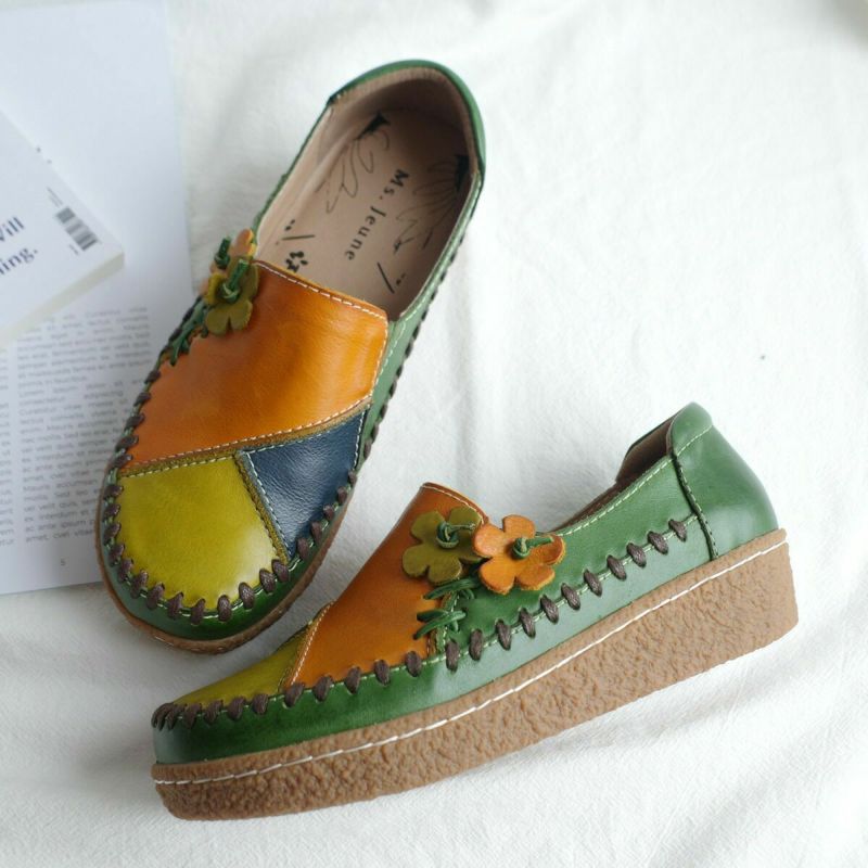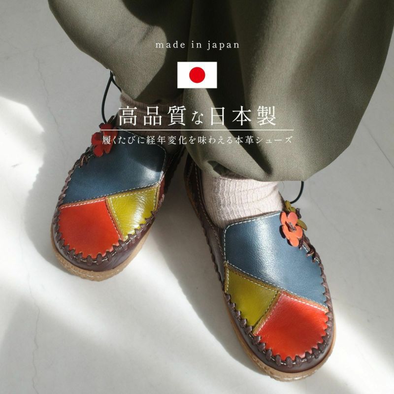 【在庫限り!特別価格!】パッチワークデザイン本革スリッポンフラワーモチーフ レディース