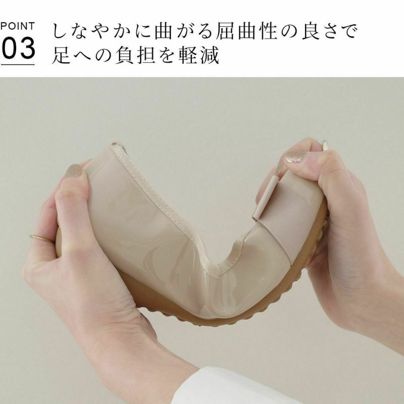 包み込まれる感覚のふかふかのインソールは衝撃吸収力抜群で腰や膝への負担を緩和します。船底ソールがつま先で蹴り出しかかとから着地するローリング歩行をサポート。