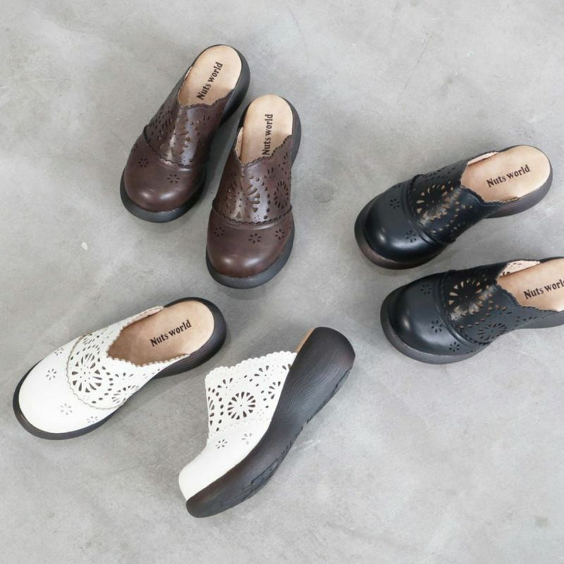 前に歩きやすい『ローリング設計』のソールがポイントです。ころんとかわいい + 歩きやすい “Nutsソール” を使ったサボサンダル。