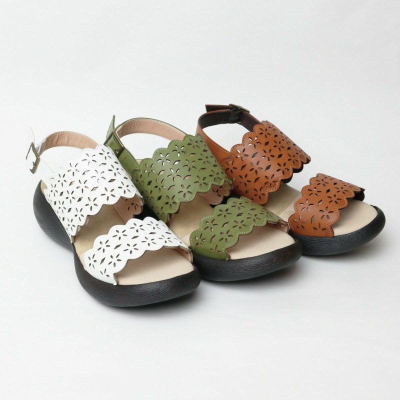 前に歩きやすい『ローリング設計』のソールがポイントです。カットワークが涼し気な春夏にぴったり。「fukamidori」「cha」「shiro」の3色展開。