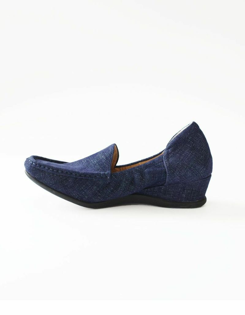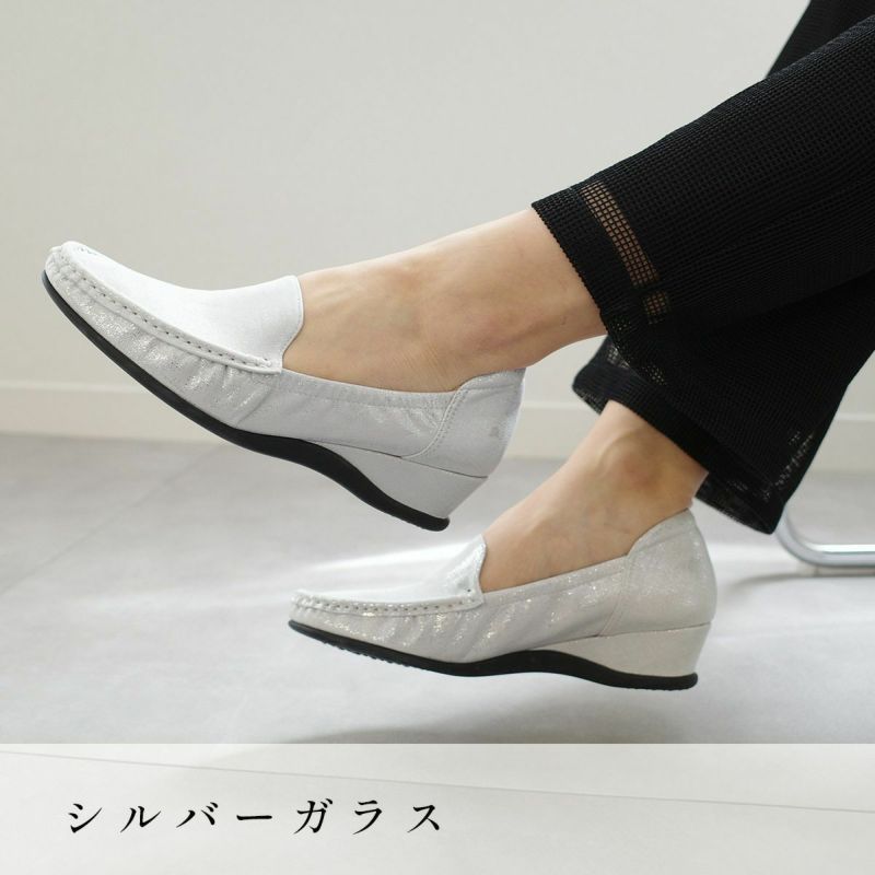 甲革全体が柔らかく、サイドのゴムによって足にフィットします。接地面の広いウェッジヒールでぐらつきにくく、安定感があります。