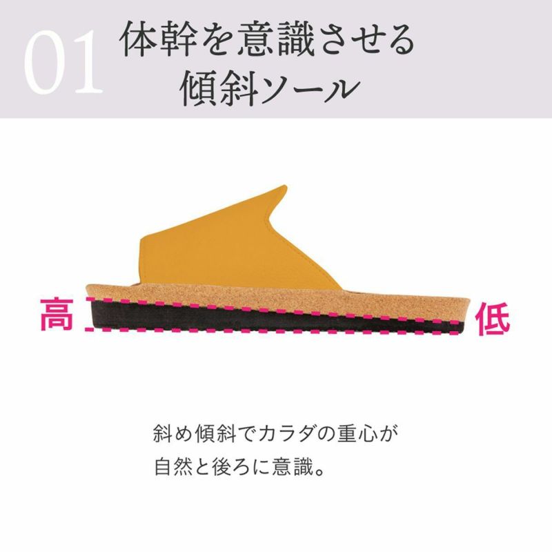 独自の傾斜ソールと中敷きで足裏全体で地面を支えて、履くだけでピンッ。