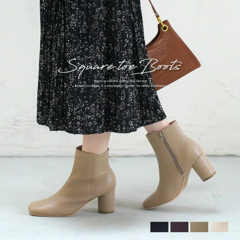 【在庫限り!特別価格!】スクエアトゥショートブーツ円柱ヒール レディース