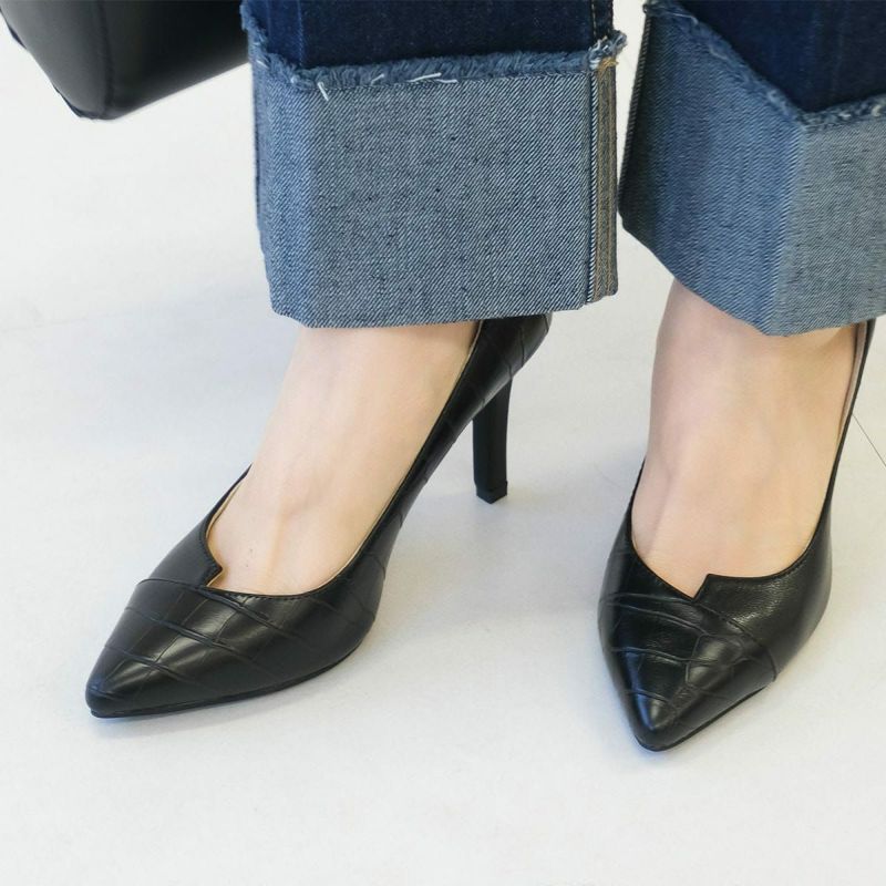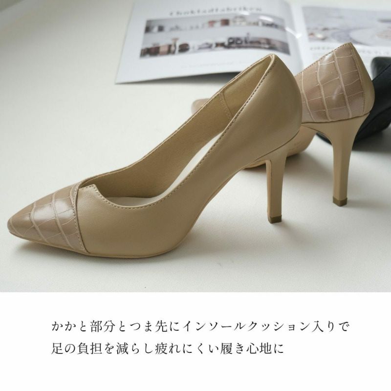 すらりとしたつま先と切り替えデザインが足元にアクセント華奢なピンヒールが脚をキレイに魅せてくれます。