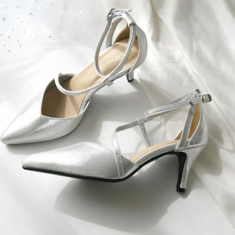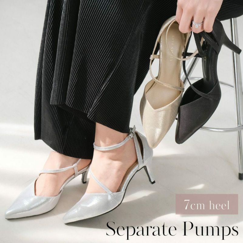 結婚式やパーティ・二次会などの華やかなシーンにおすすめ。7cmヒールのセパレートパンプスは、結婚式やパーティーに最適。