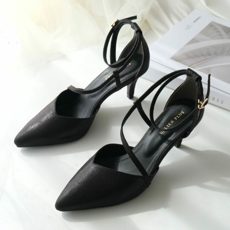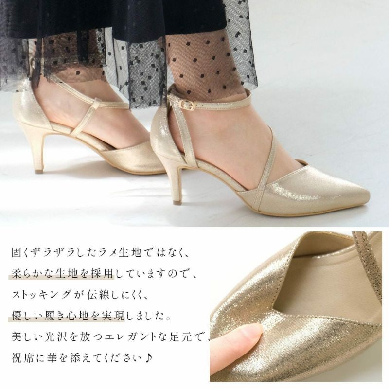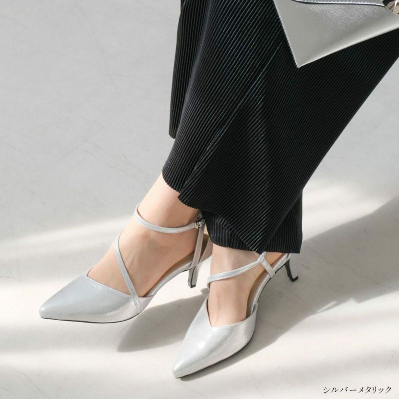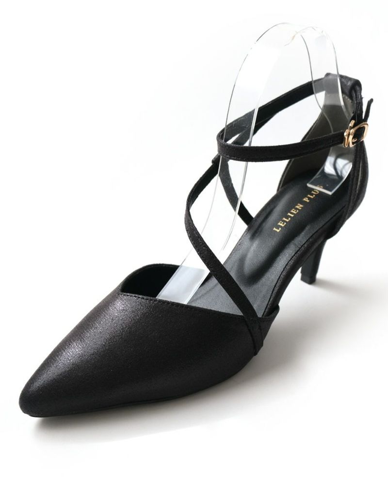 Vカットの甲が脚を美しく見せます。アンクルストラップでフィット感を調整可能。