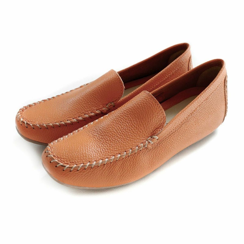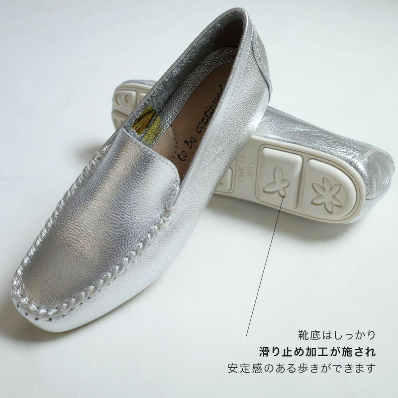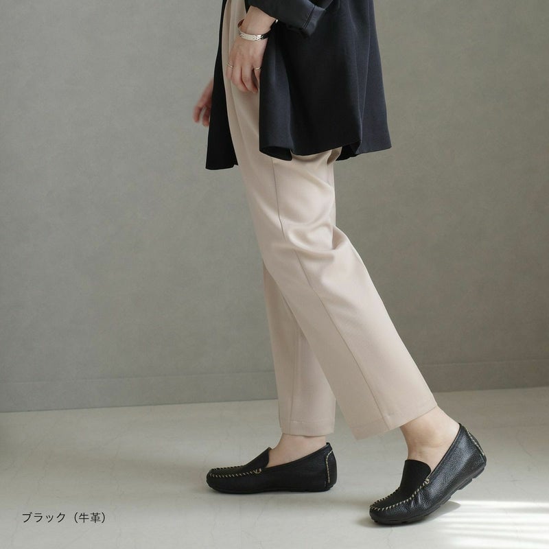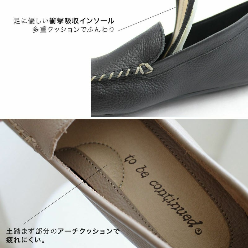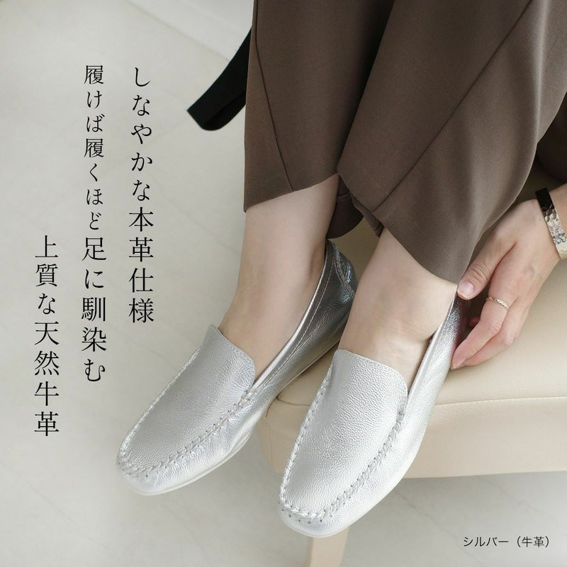 低反発クッションで心地良くフラットに見えて実はインヒール入りで歩きやすく、脚長効果も◎ナチュラルな本革使い