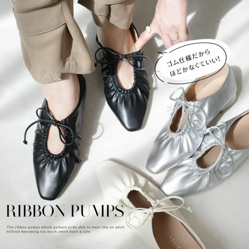 脱ぎ履きスムーズ!甲部分ゴム仕様のギャザーリボンパンプス