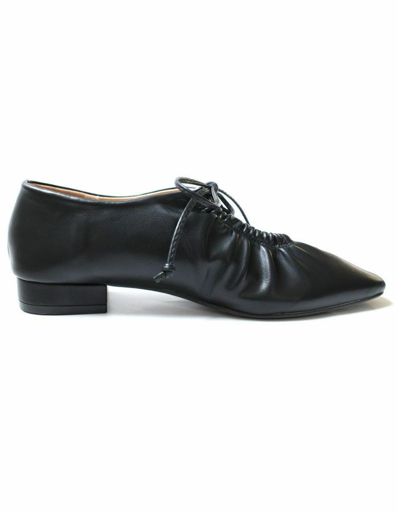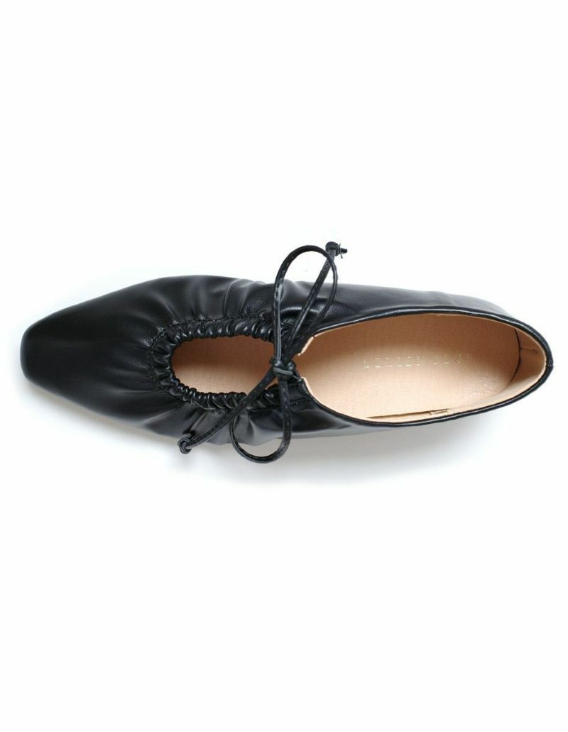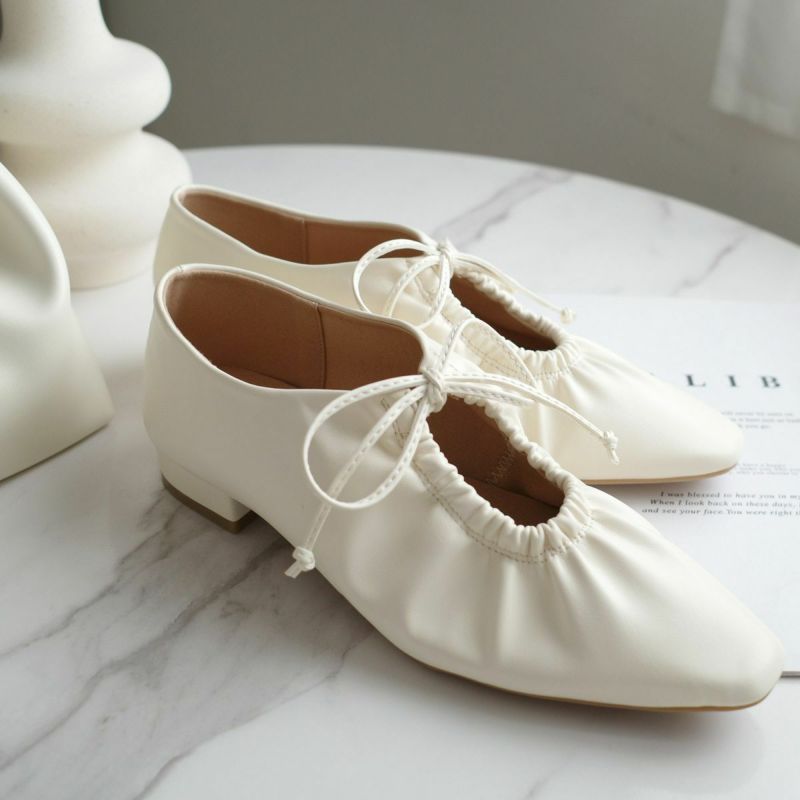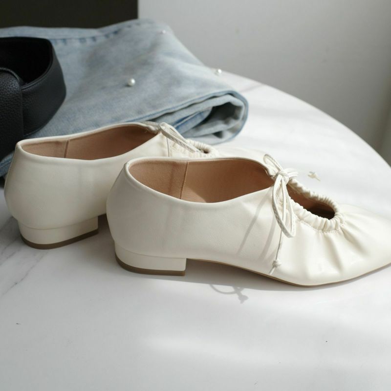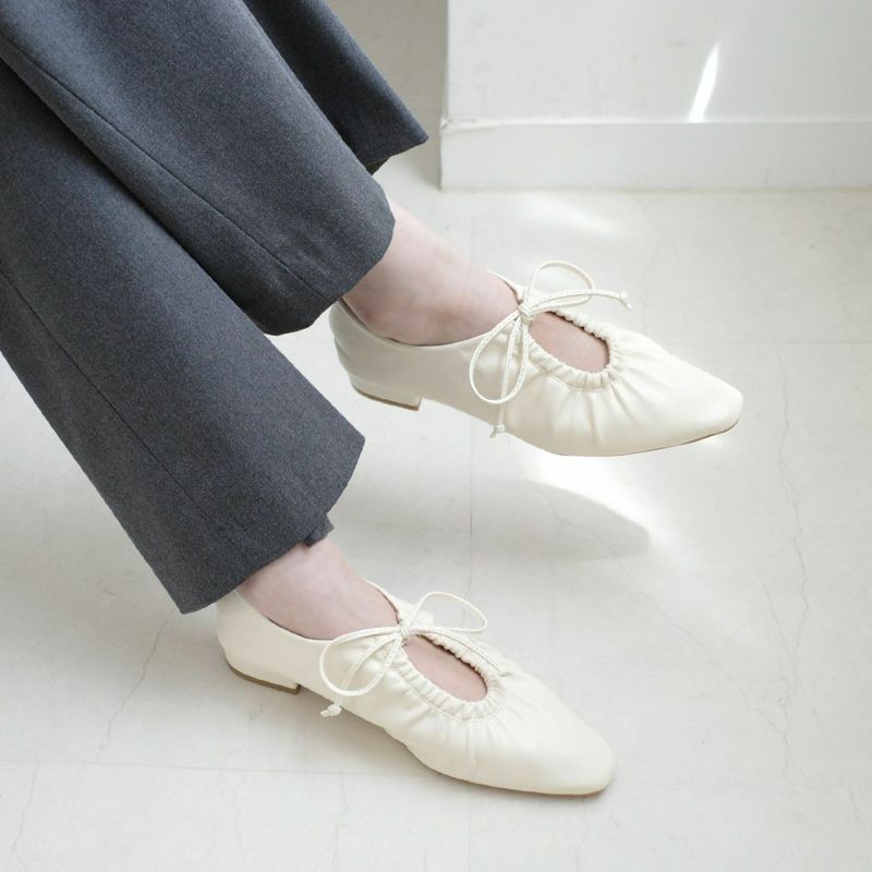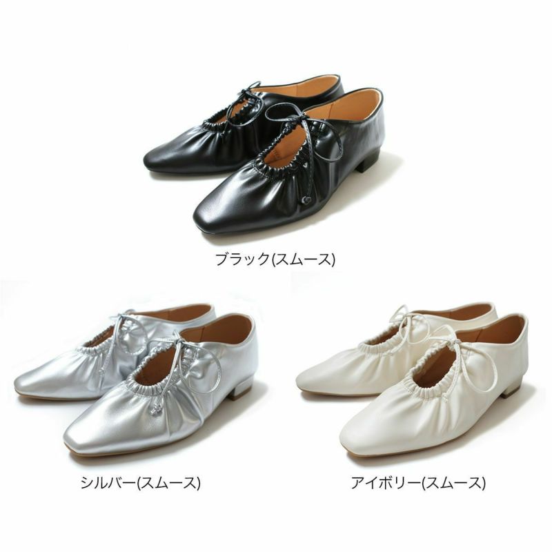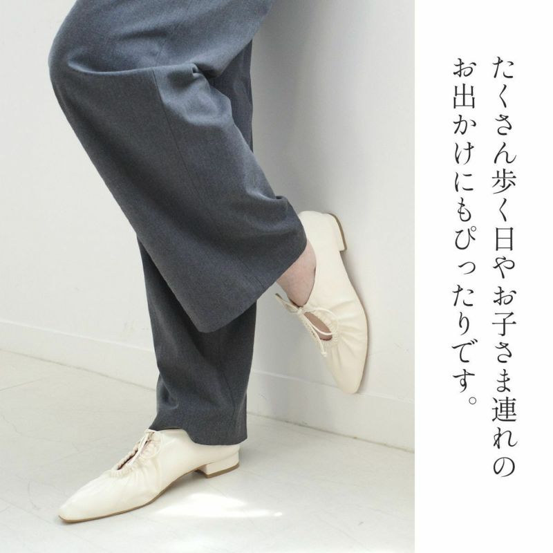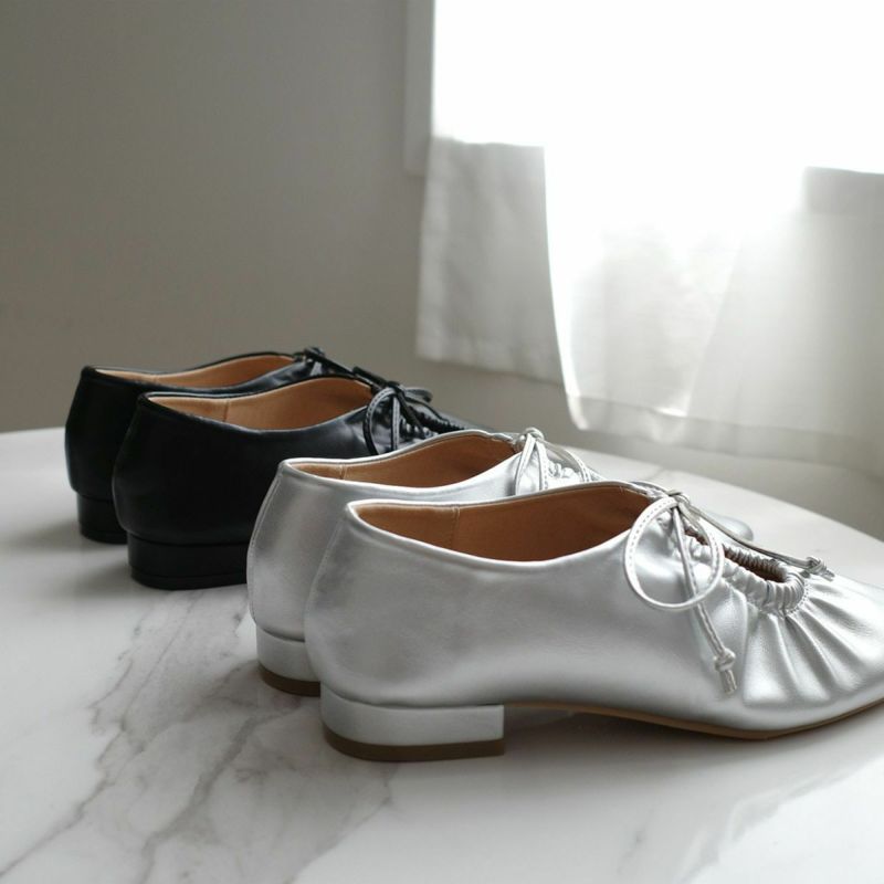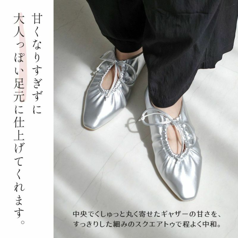 中央でくしゅっと丸く寄せたギャザーの甘さを、すっきりした細みのスクエアトゥで程よく中和。