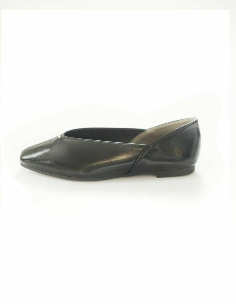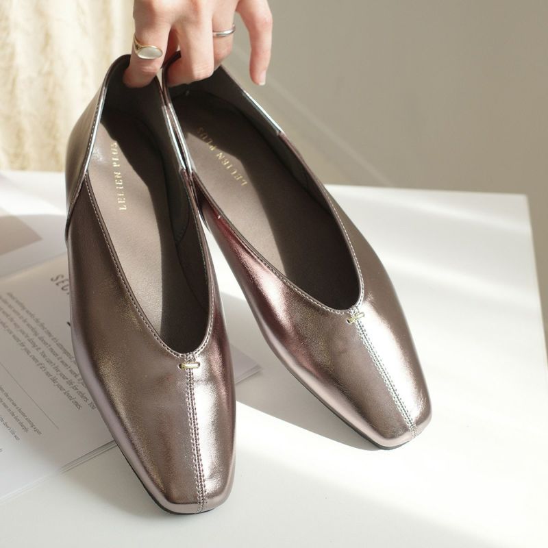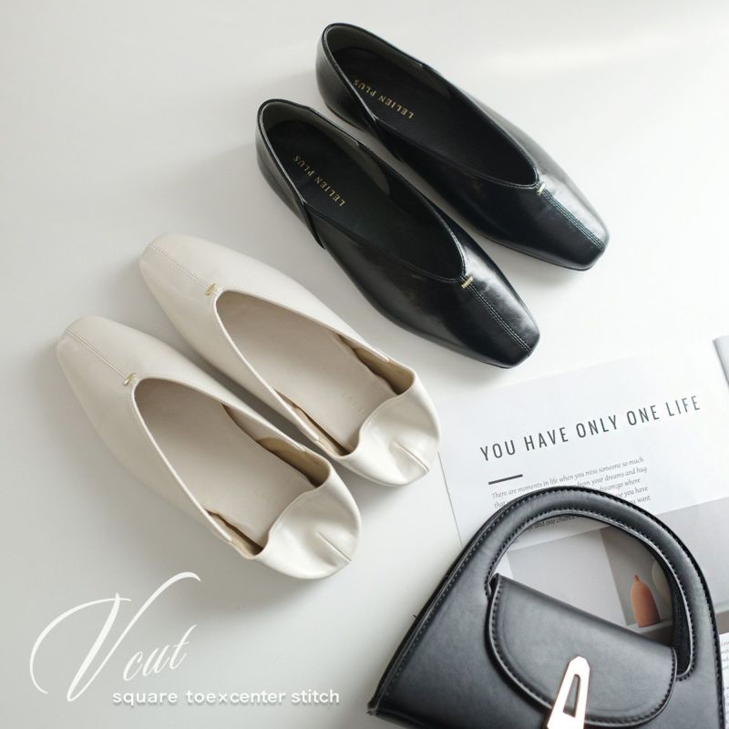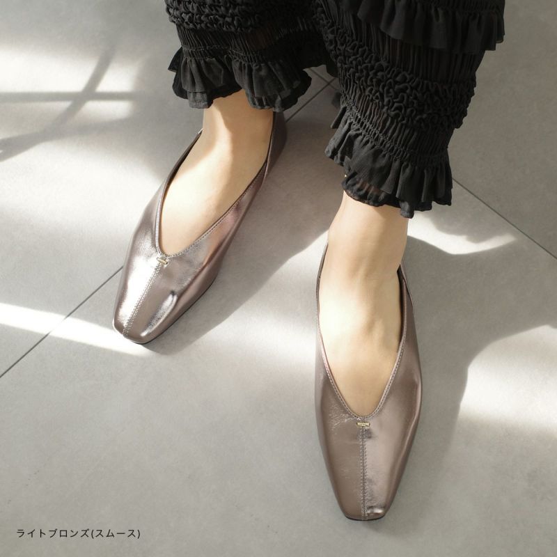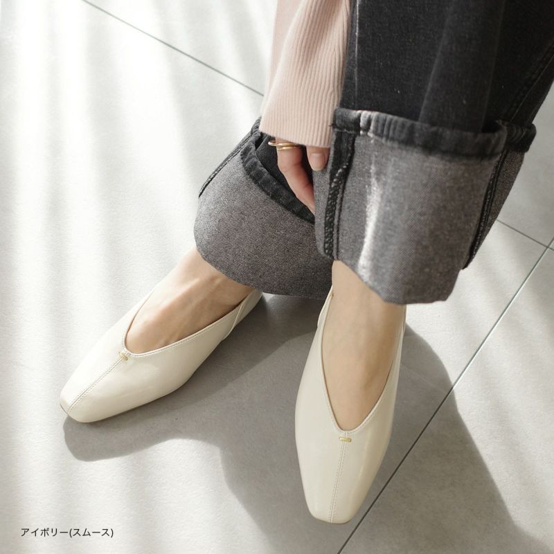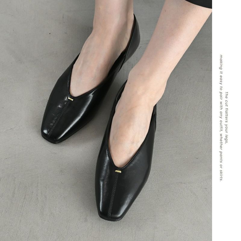 スクエアトゥ×センターステッチで足をキレイに華奢みせゴールドパーツがシンプルながらアクセントに、履くだけでこなれた印象になります。