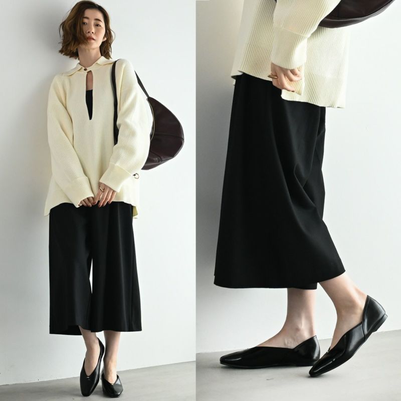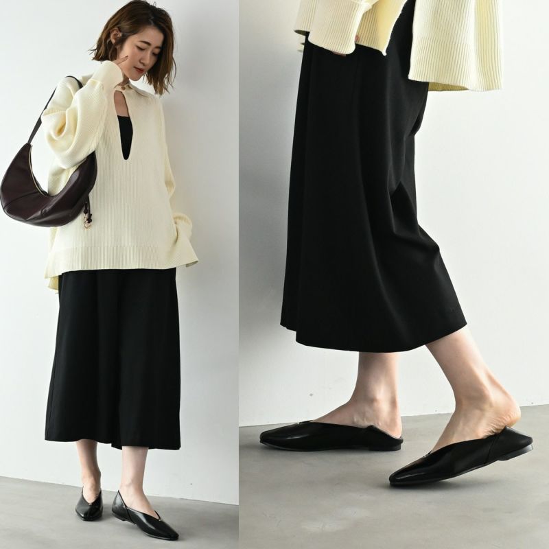 Vカットで足を綺麗に見せてくれるので、パンツやスカートどんなコーデにも合わせやすいです。