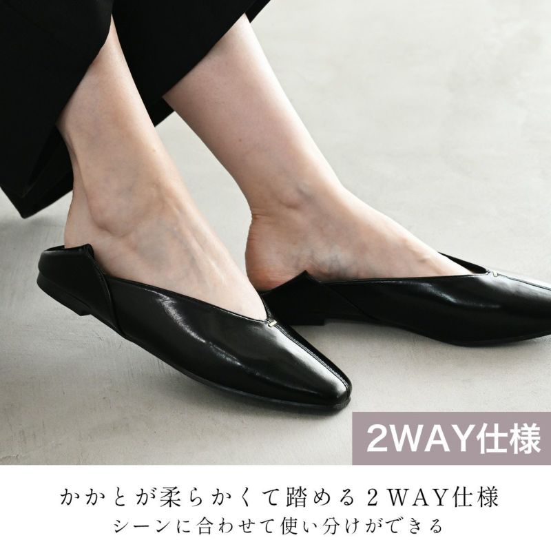 スクエアトゥ Vカット ゴールドアクセント パンプス ローヒール バブーシュ レディース