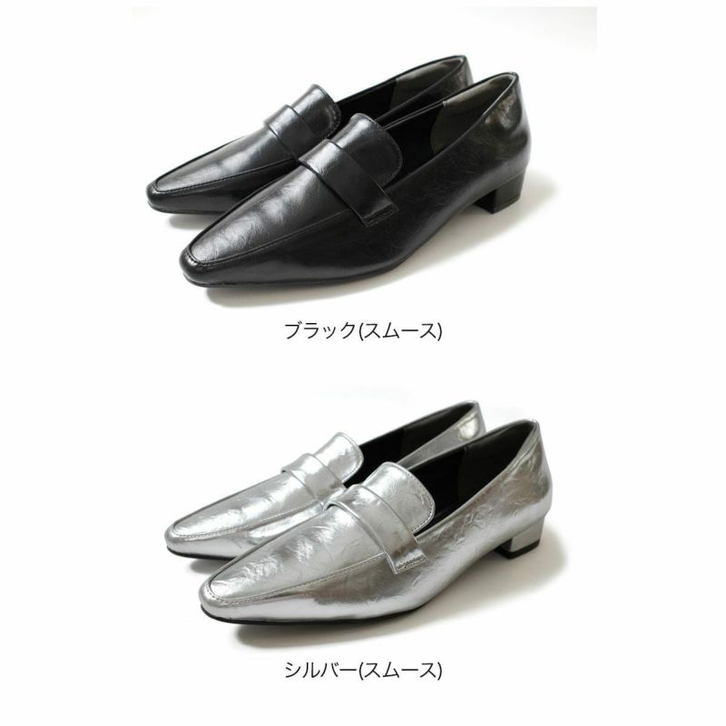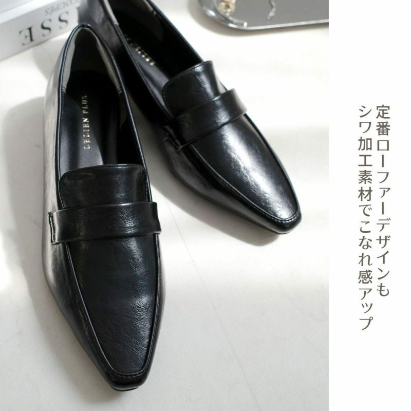 定番のコインローファーもシワ加工素材を使用することでこなれ感がアップ。足への負担を軽減してくれる低反発クッションインソール、かかとのパカパカを防ぐかかとクッションで快適な履き心地です。