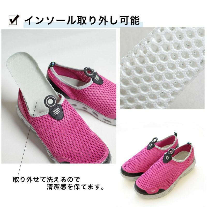 速乾性・衝撃吸収性の高いインソールで快適な履き心地!紐なしで脱ぎ履きしやすく、アッパーとかかとのつまみでぬれた足でも脱ぎ履き楽ちん!