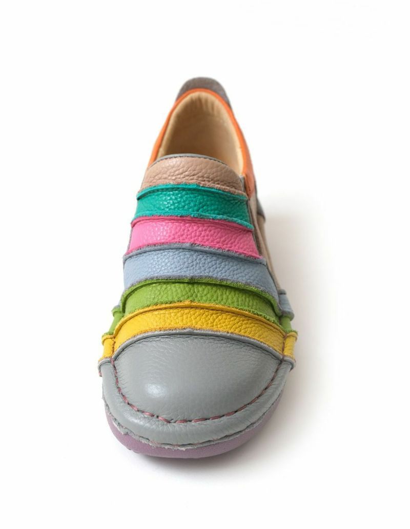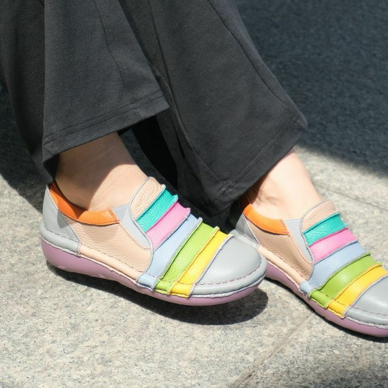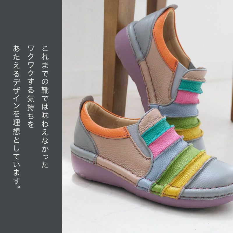 牛革パーツを1本1本丁寧に縫い合わせた大人気のカラフルサイドゴアスリッポンころんとしたまぁるいフォルムが可愛く、合わせやすいボーダーデザイン。