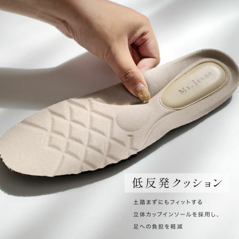 甲深デザインでありながら、履き口の両サイドにほどこしたゴムにより、着脱がしやすく気軽に履けます。つま先の丸みが高すぎず低すぎず、大人っぽく見える絶妙なフォルムを追求しました。