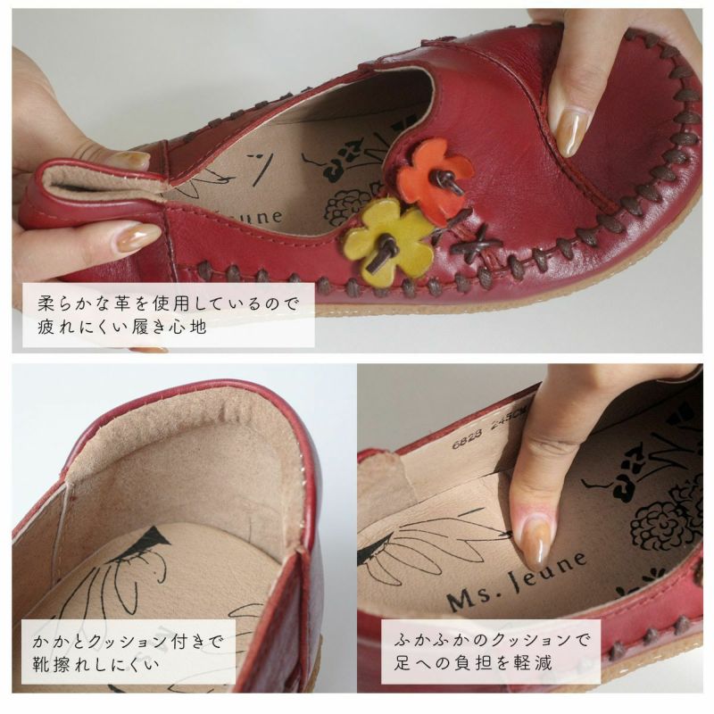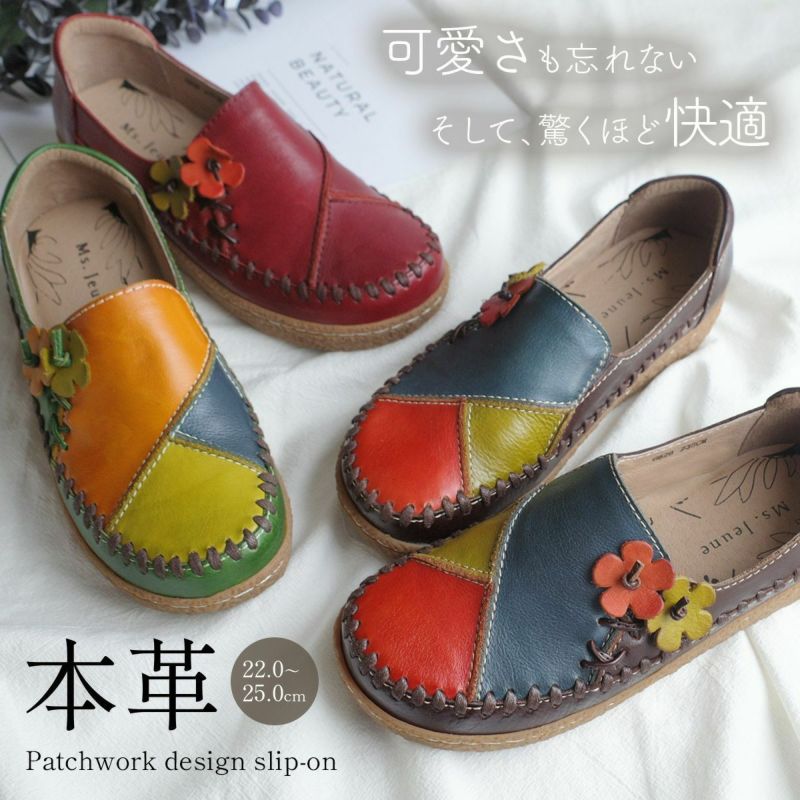 【在庫限り!特別価格!】パッチワークデザイン本革スリッポンフラワーモチーフ レディース