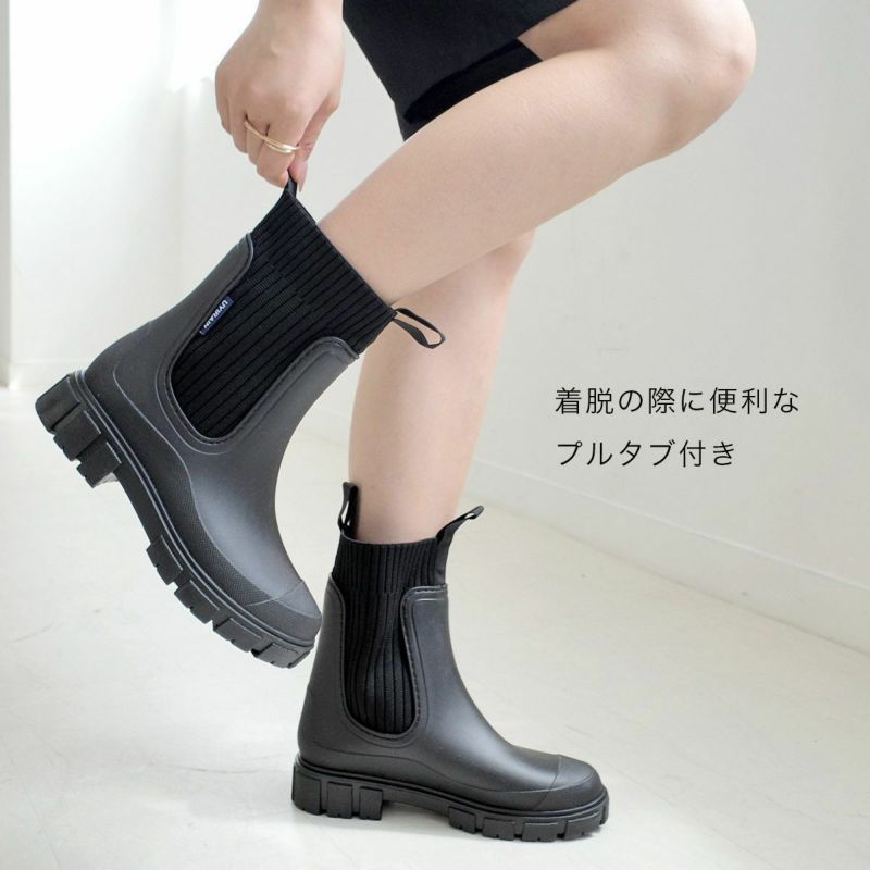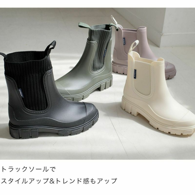 厚底レインブーツショートブーツサイドゴアリブニット長靴レインシューズトラックソール レディース