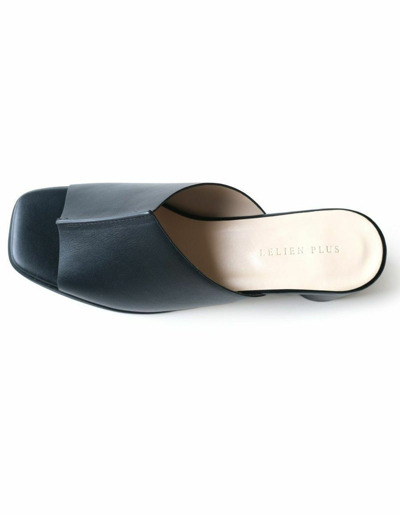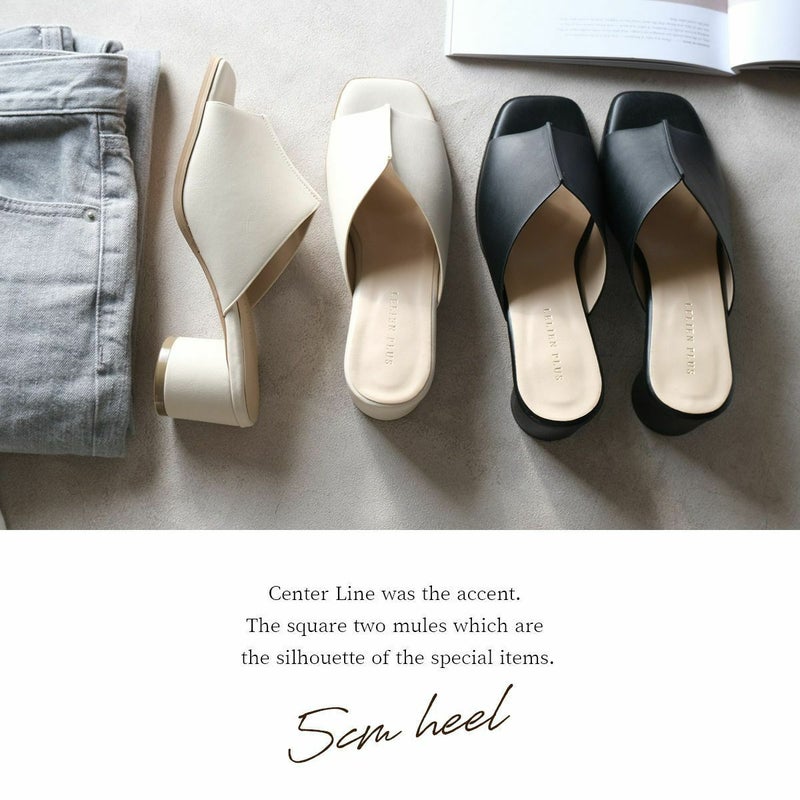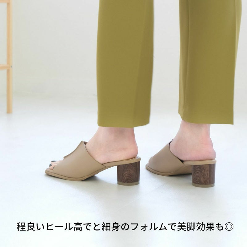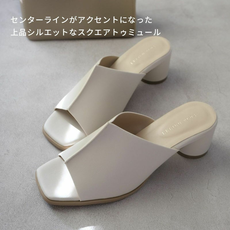 程良いヒール高でと細身のフォルムで美脚効果も◎センターラインがアクセントになった上品シルエットなスクエアトゥミュール。