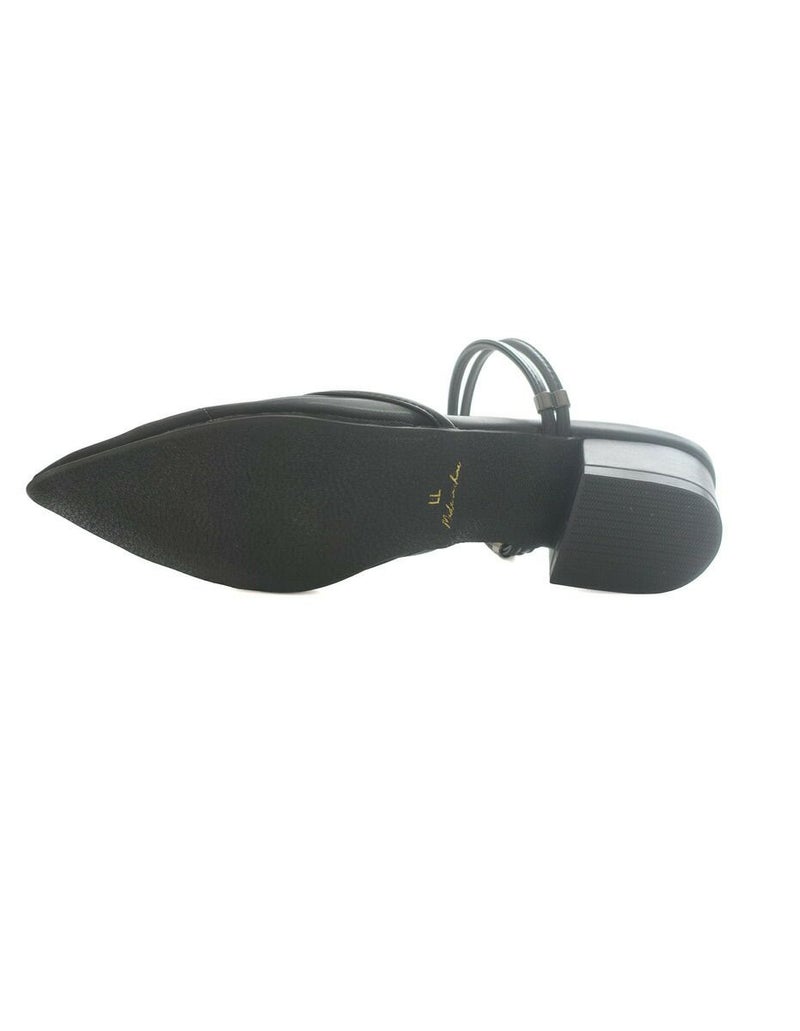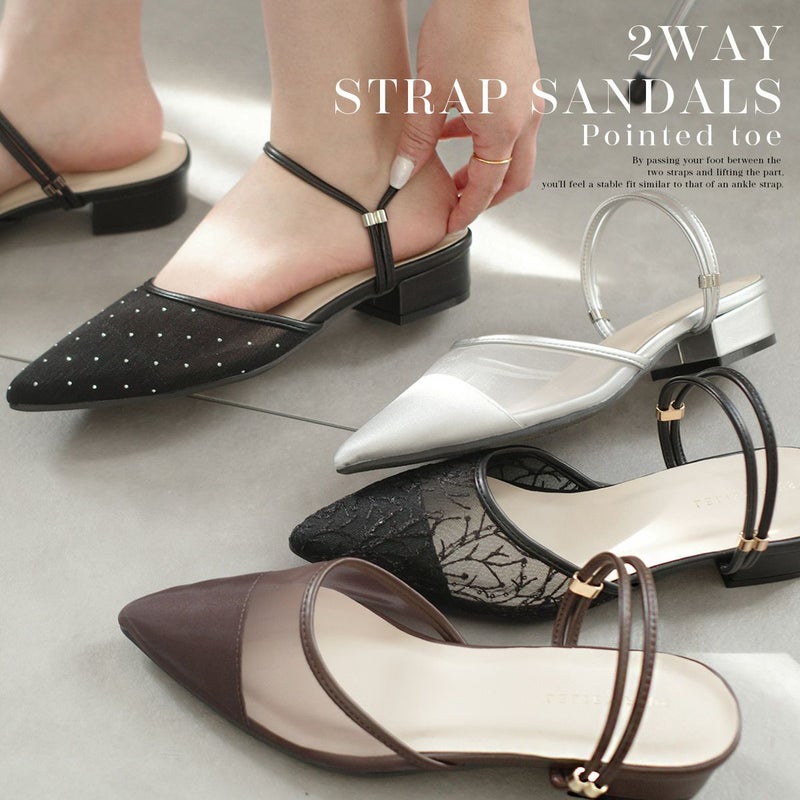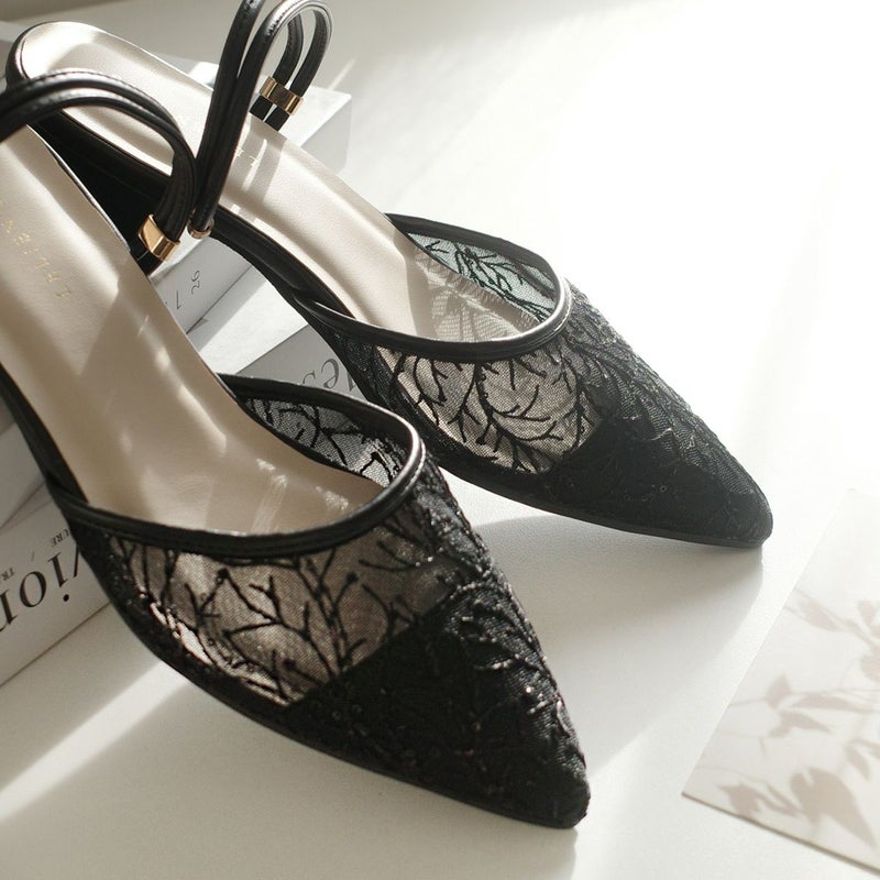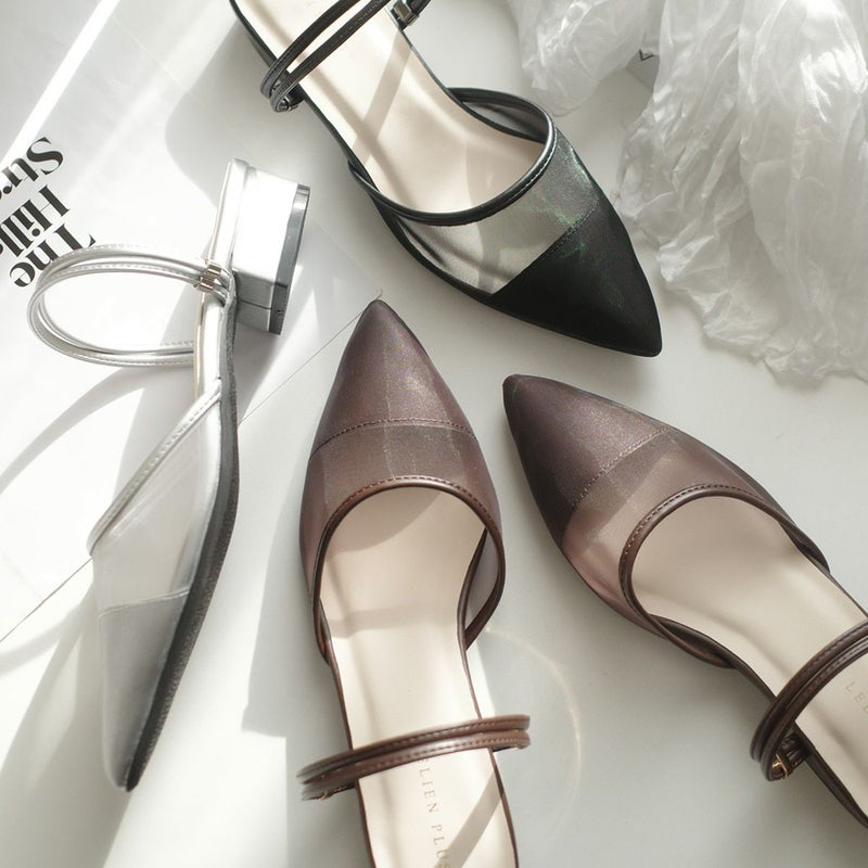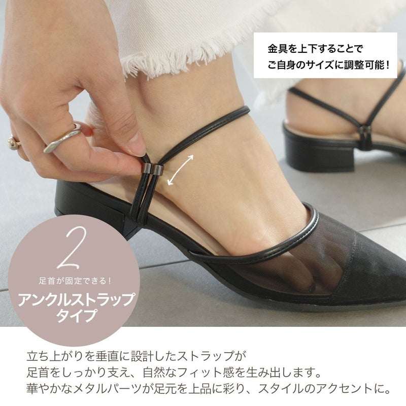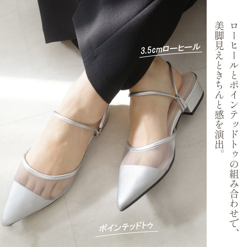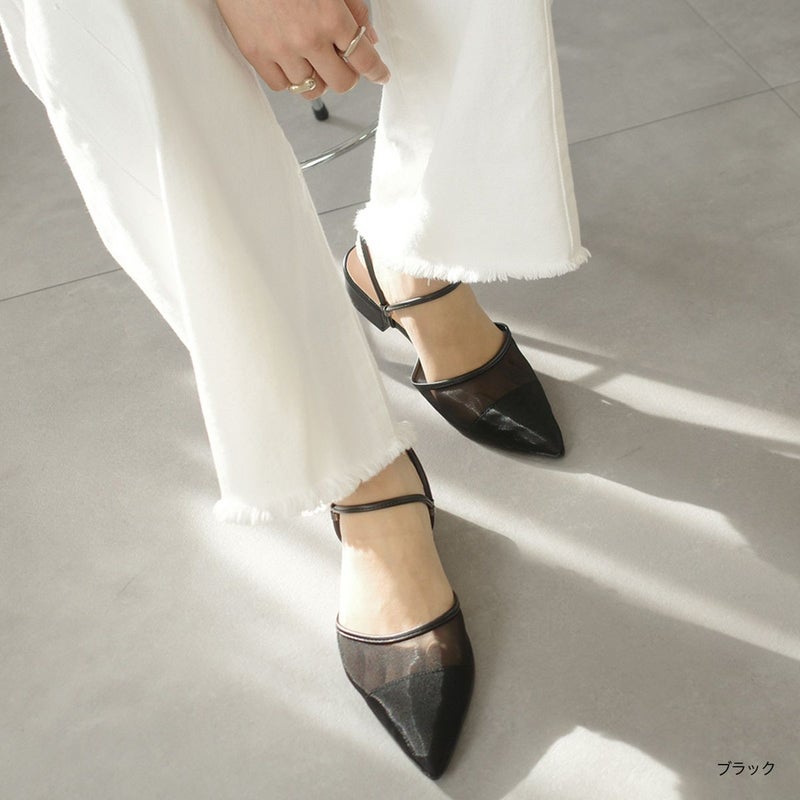 3.5cmのローヒールとポインテッドトゥの組み合わせで、美脚見えときちんと感を演出。立ち上がりを垂直に設計したストラップが足首をしっかり支え、自然なフィット感を生み出します。