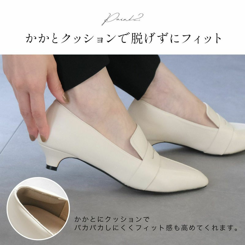 低めのヒールで疲れにくく歩きやすいクッション性のあるインソールとかかとクッションで脱げずにフィットした履き心地。