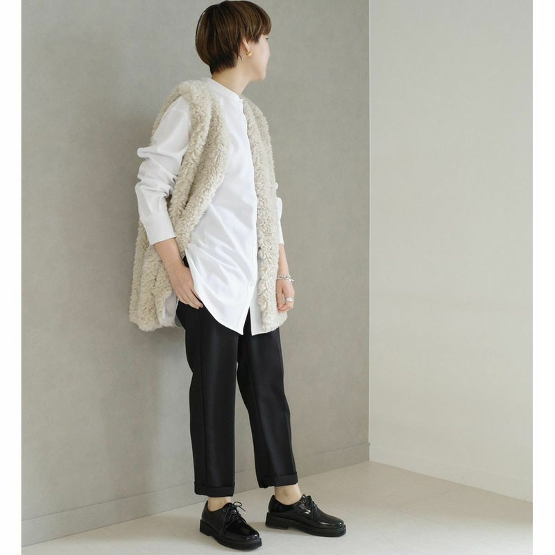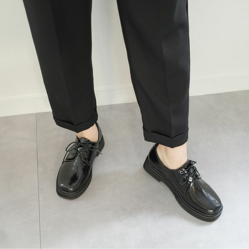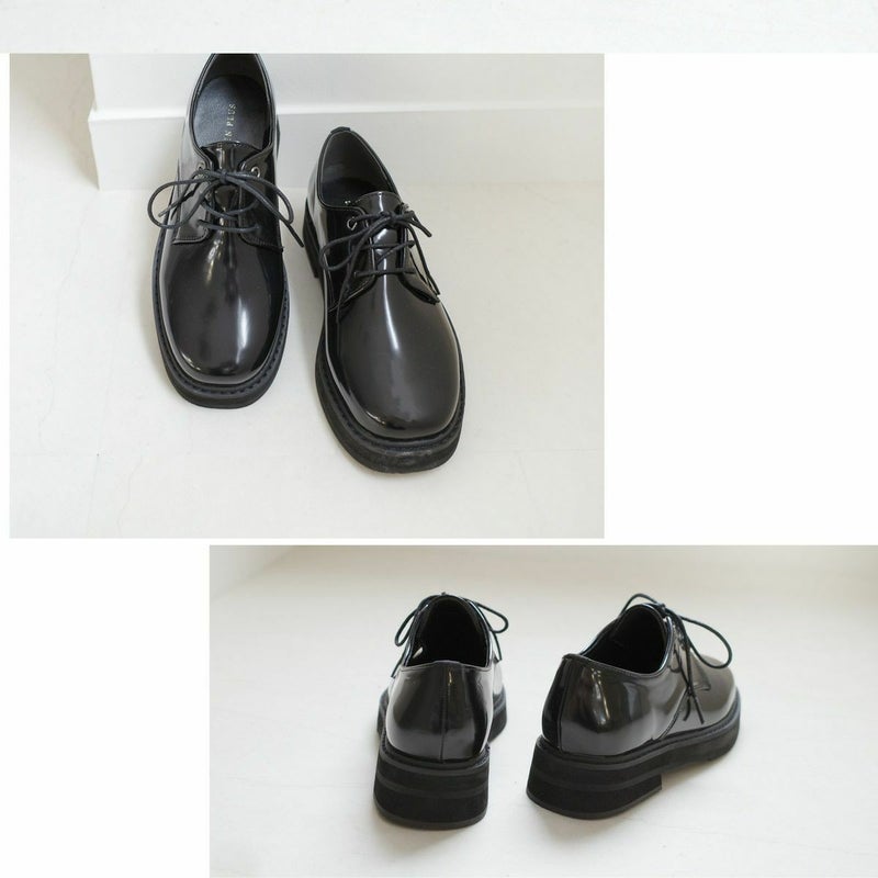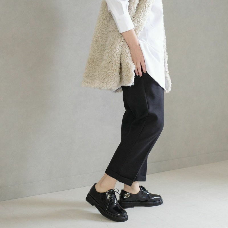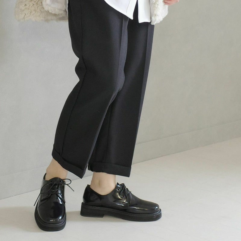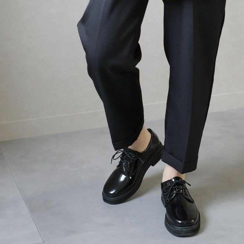 コバやソールにボリュームを出し、シンプルながらにもこなれた印象に。程よいツヤ感のあるガラス調スムース生地を使用し、高級感ある見た目に。